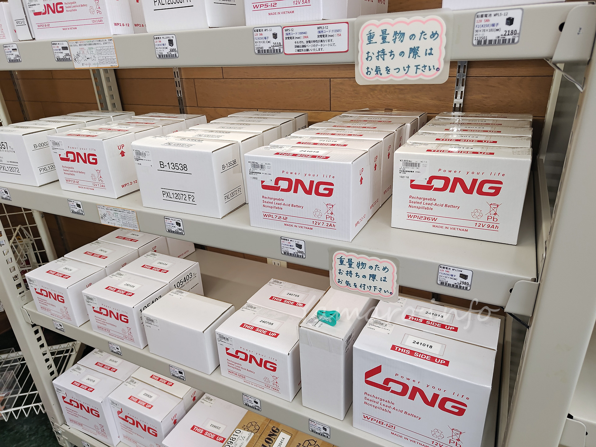 バッテリコーナーも充実。主にLONGブランドのバッテリが売られていました。UPSの互換バッテリで急ぎの際は、また利用したいですね。