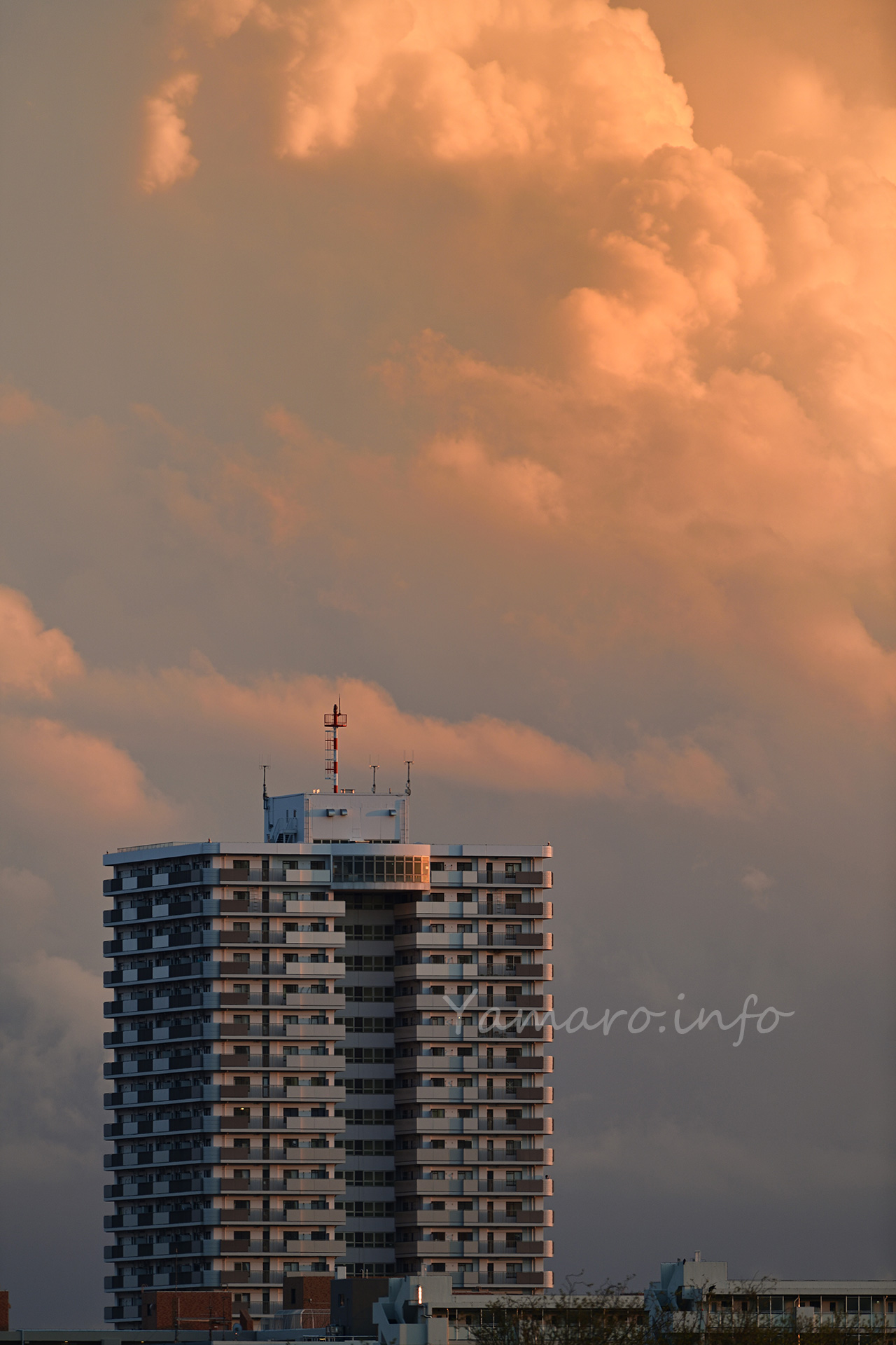 望遠レンズって、なかなか縦位置で撮らないのですが、今回ばかりは三脚でしっかりと縦位置でも撮りました。雲とマンションの別世界感。