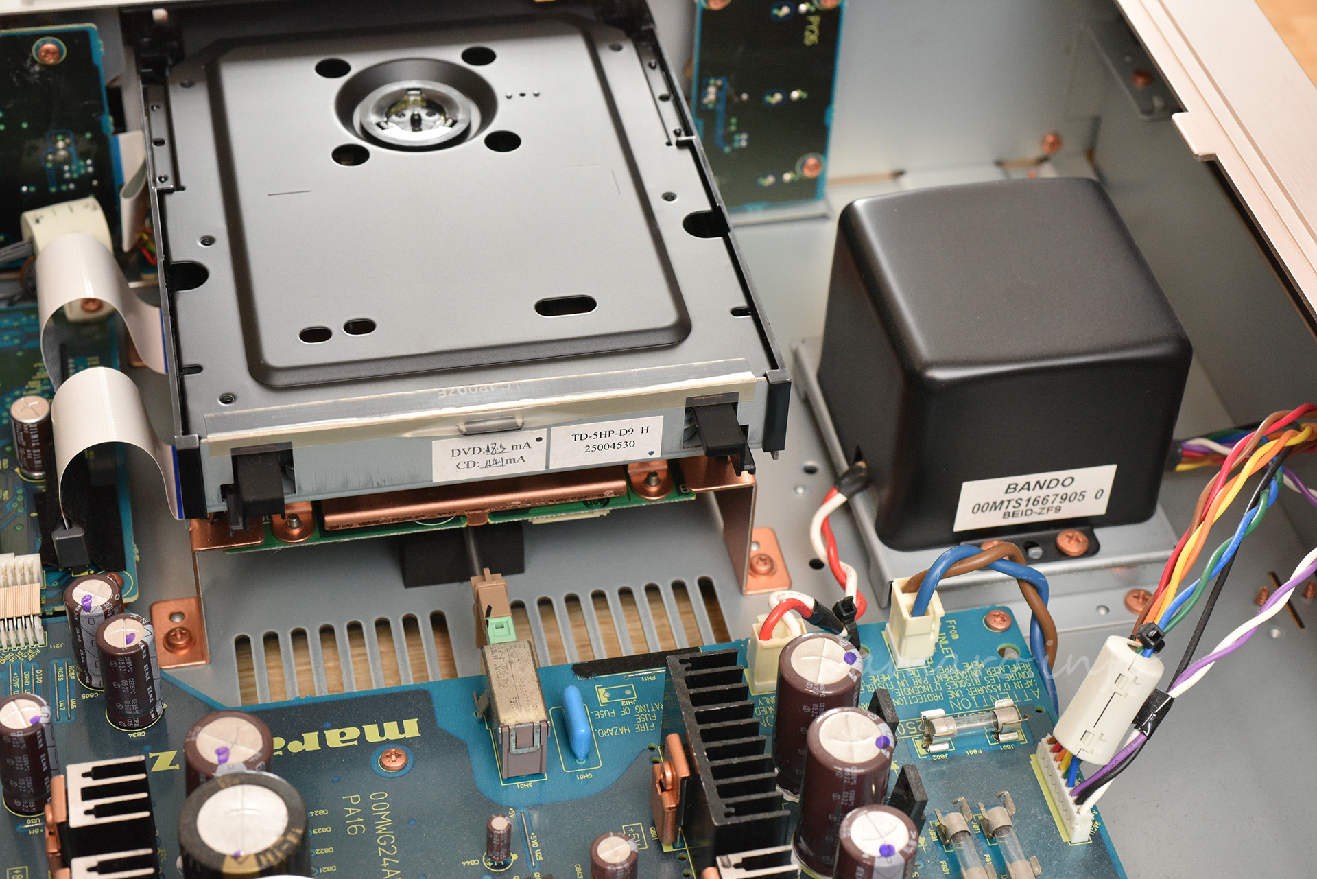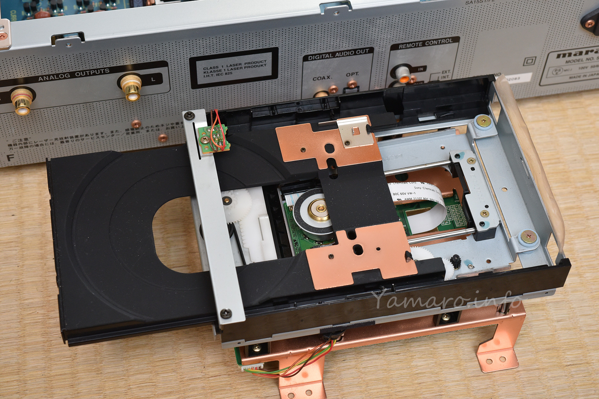 CD/SACDドライブも、カタログでは自社製品と謳っていましたが、例えば往年のTEACのVRDSメカと比べたら、それはそれはしょぼいの一言です…。ドライブ後ろのラベルにDVDと表記があるように、このドライブはDVDプレーヤーと併用していたと思われ、おそらくこの当時のmarantzのDVD/SACDプレーヤーである、DV-9500やDV-9600辺りと同じものを使っているのでしょうね。SACDフォーマットも、結局はDVDの流用でしょう。