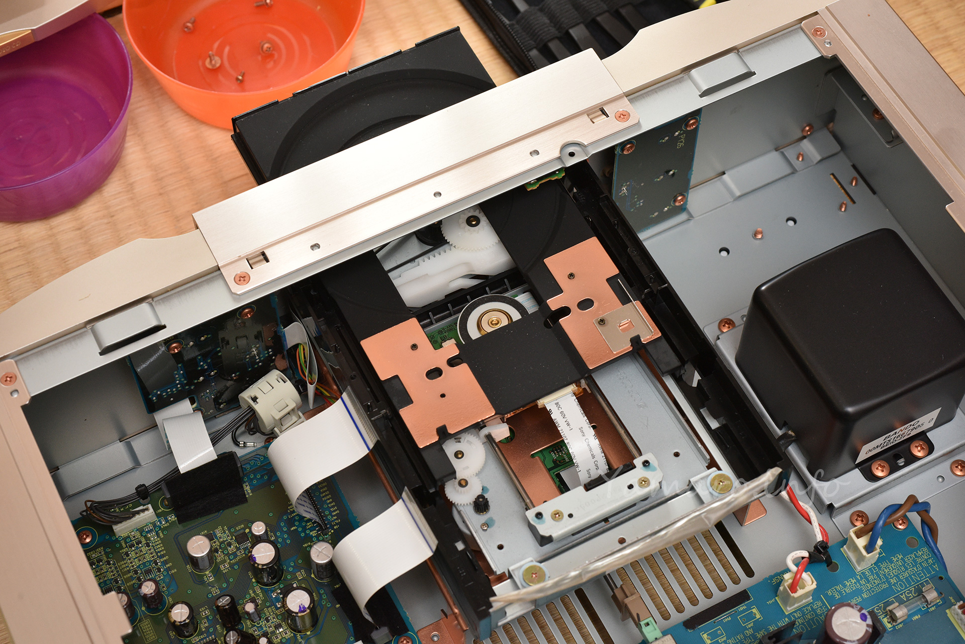 トレイの先端飾りとFFC2つを抜いたら、後はドライブの足元4箇所の銅メッキネジを外すと、ドライブが抜けます。