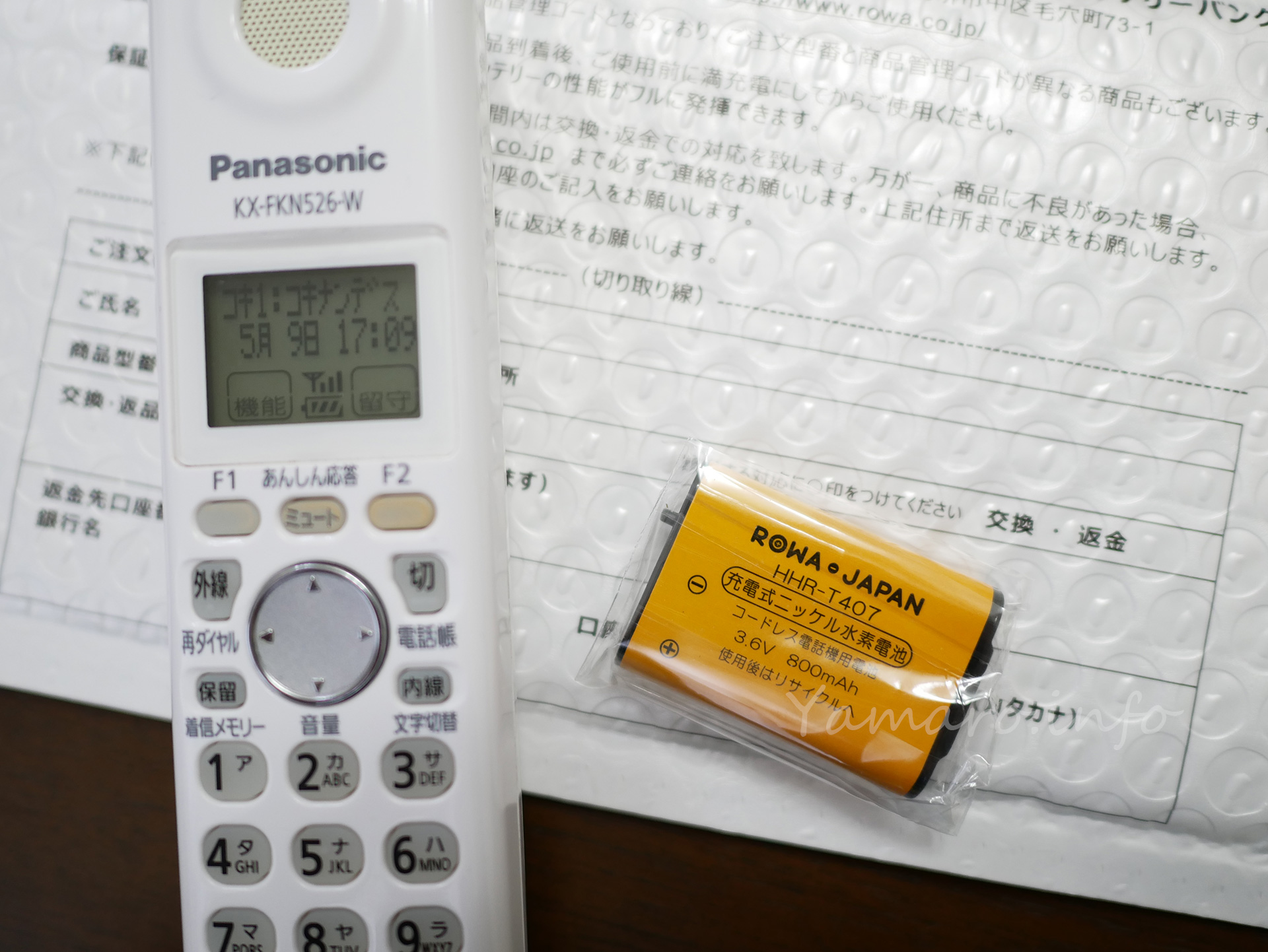 ここ最近、電話もちょっと増えてきたのですが、Panasonicのコードレス受話器の電池が、買って9年、そろそろ寿命で突如電池切れも発生するようになってきたので、互換品のバッテリを買ってみました。