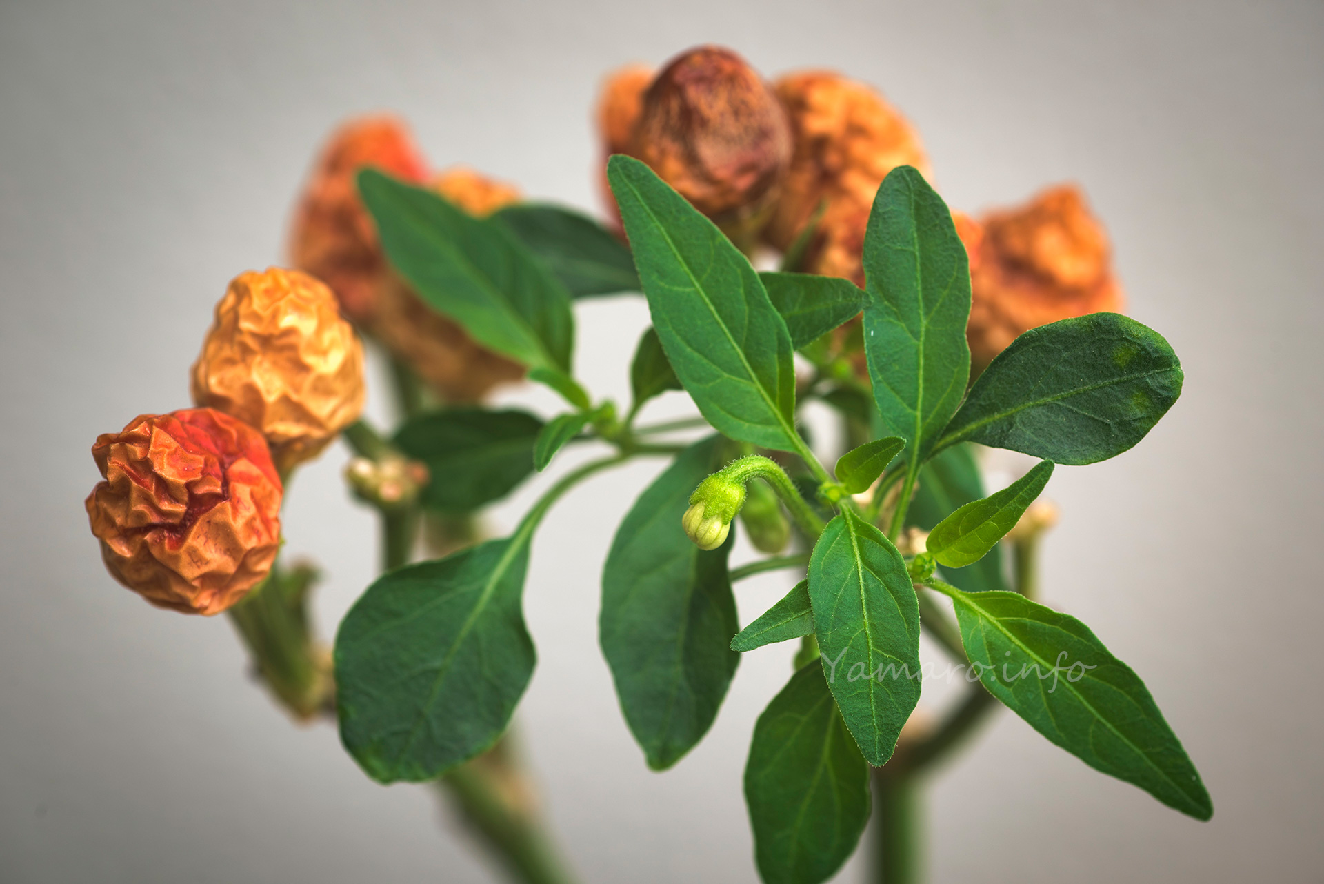 というわけで、枯れかかっていたと思いきや、このところの陽気で復活気味の、ベランダの五色トウガラシを撮ってみました。