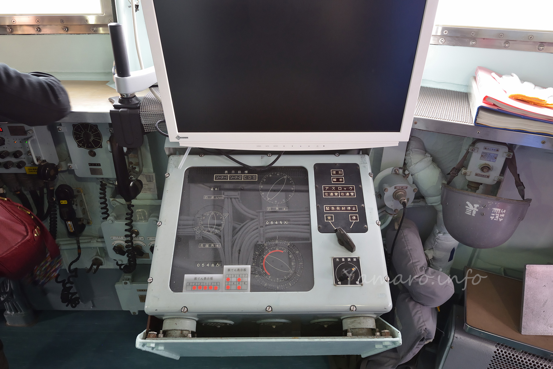 対潜コンソール?には、おそらく昔はCRT出会ったであろう表示装置、2014年時点で液晶モニタに。ソーナー(一般にソナーと言われている潜水艦の音響探知は、自衛隊ではソーナーと表記します)とCDS(Conbat Direction System:戦闘指揮装置)の表示があり、それぞれのデータから目標の方向や深度などが表示されるのかな? その下には、魚雷発射管とアスロック発射機の装填表示もありますが、赤丸は装填されているのでしょうね。ただ赤丸が訓練弾なのか実弾なのかは不明です。