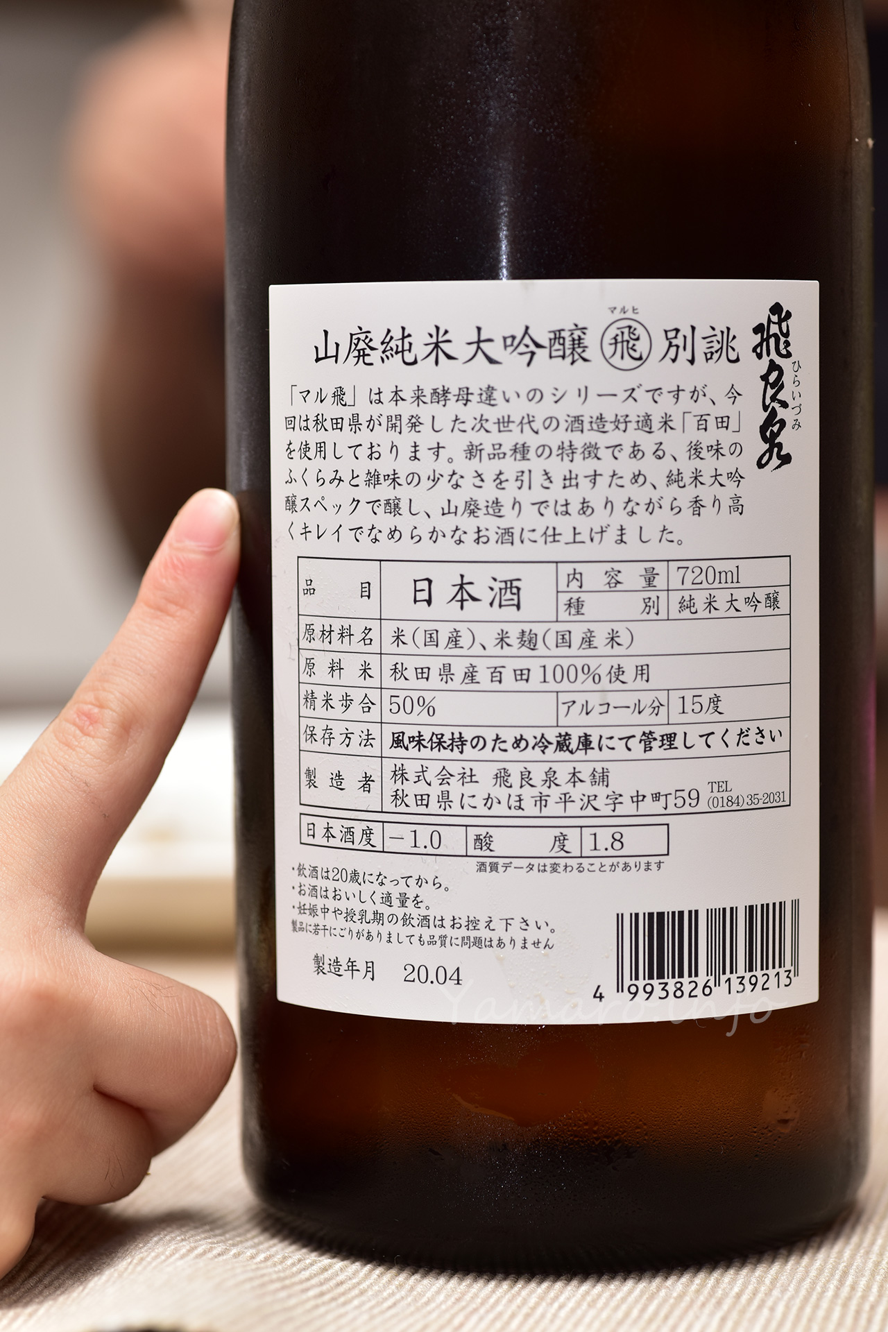 飛良泉でも「マル飛」はいろいろな酒米や酵母を使って醸しているシリーズですが、今回のは山廃づくりだそうです。