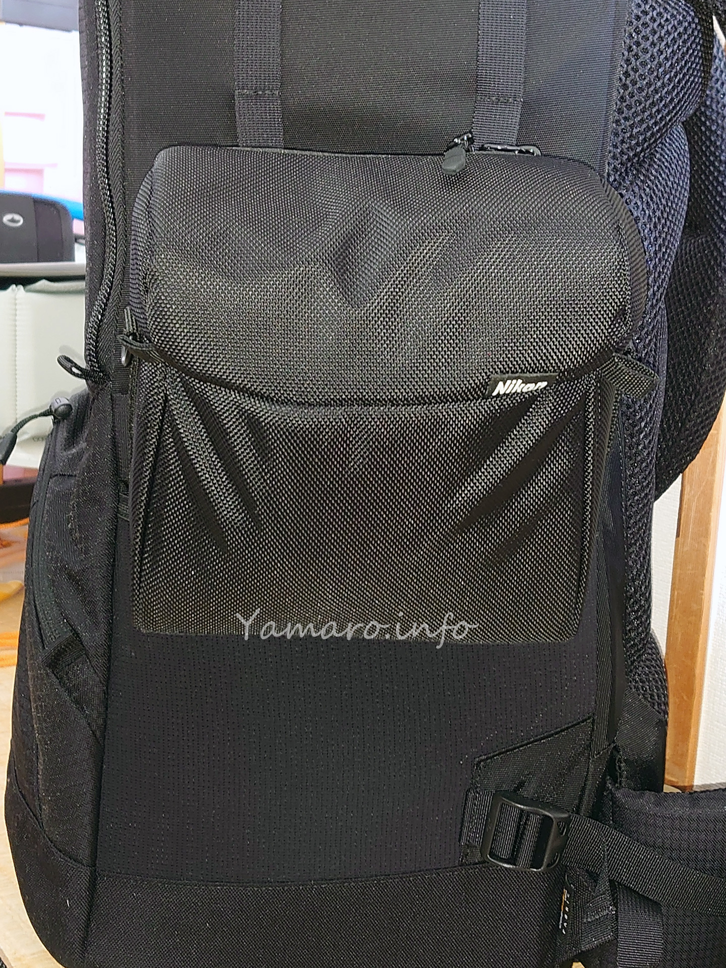 標準ズームとしてはかなり大柄な、AF-S NIKKOR 24-70mm f/2.8E ED VRですが、若干膨らむけどしっかりジッパーで蓋も閉じられます。斜めに入れることになるけど、隙間に小柄なレンズなら1本収められそうな感じです。