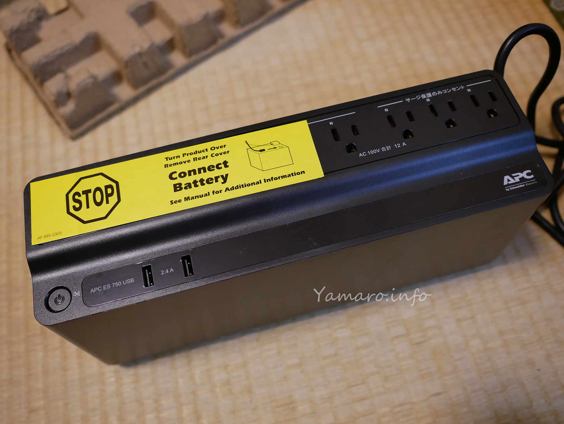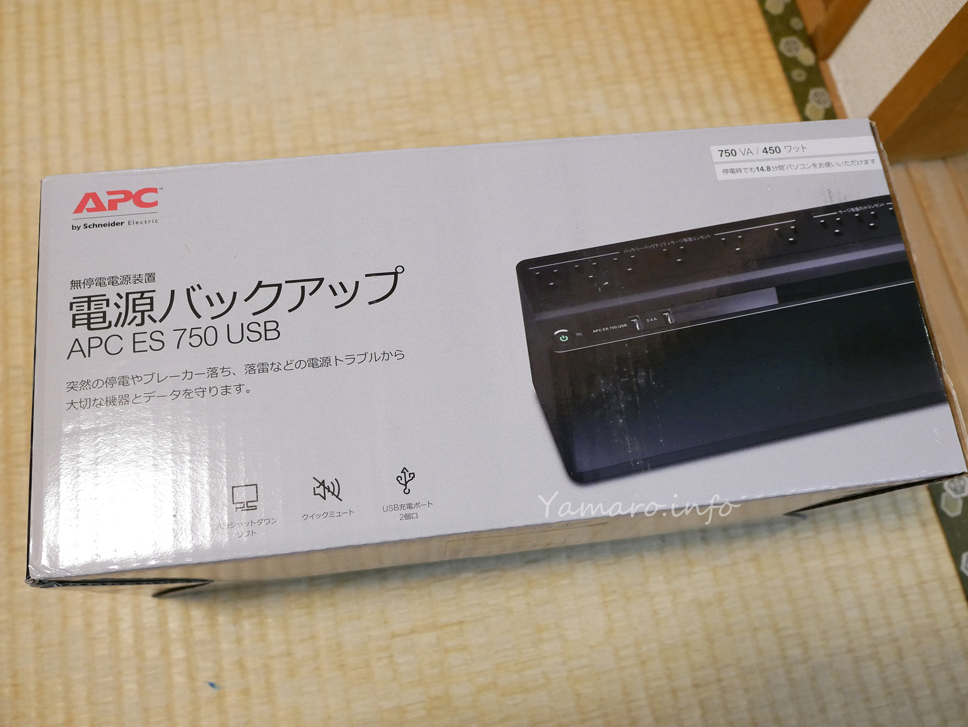 APC ES 750 USBの4年保証モデル、750VA(450W)矩形波出力のモデルです。我が家では3台のUPSが稼働していて、ルータやHub、NASなどネットワーク機器全般、PC、テレビとレコーダーとそれにぶら下がるUSB-HDD、全てUPSを接続しています。