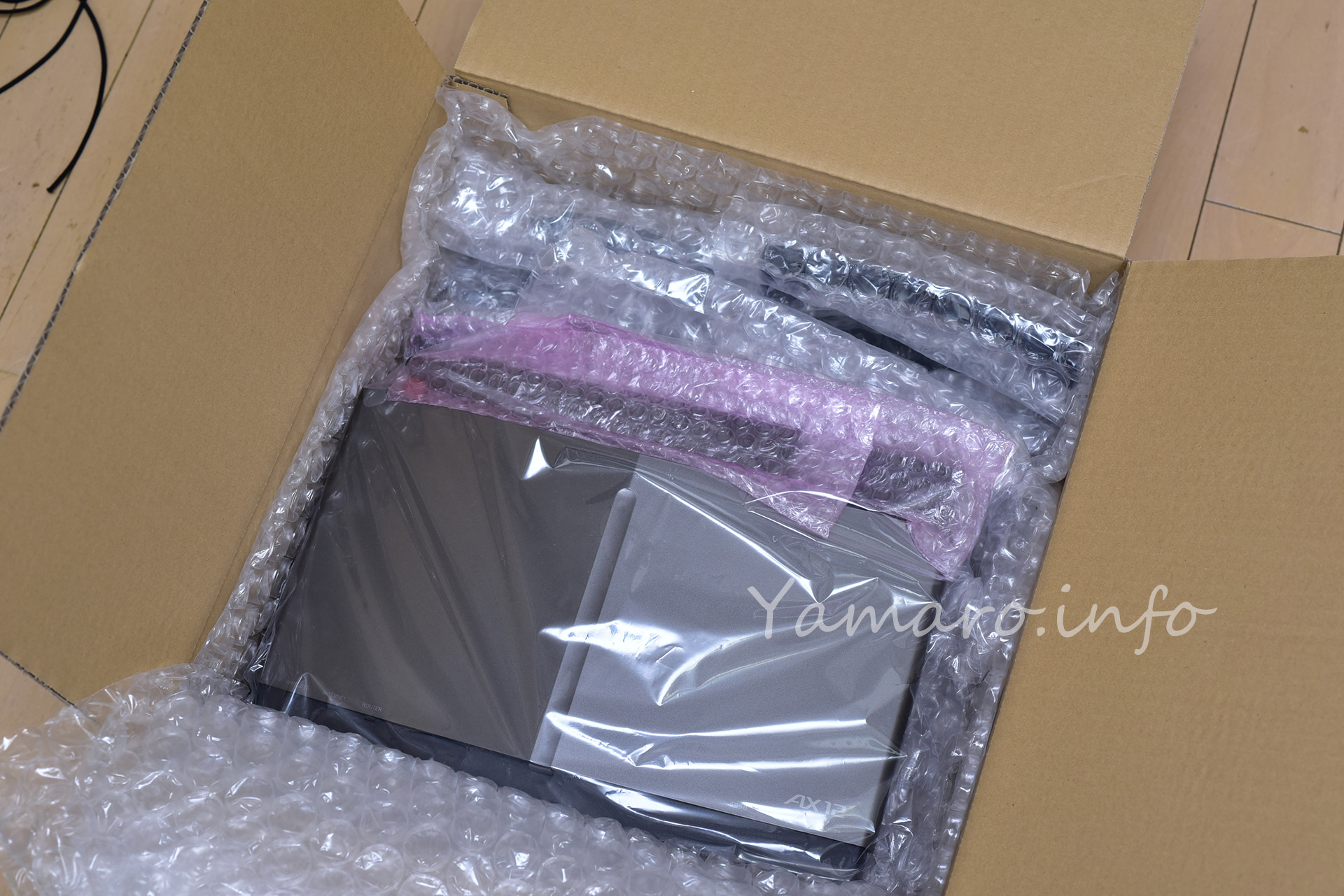 再調整品なので、外箱はなく、プチプチで本体と付属品を包んであるだけです。今は説明書も何もかもダウンロードの時代なので、余計な箱も不要ですね。これからの時代、これで十分な気もします。
