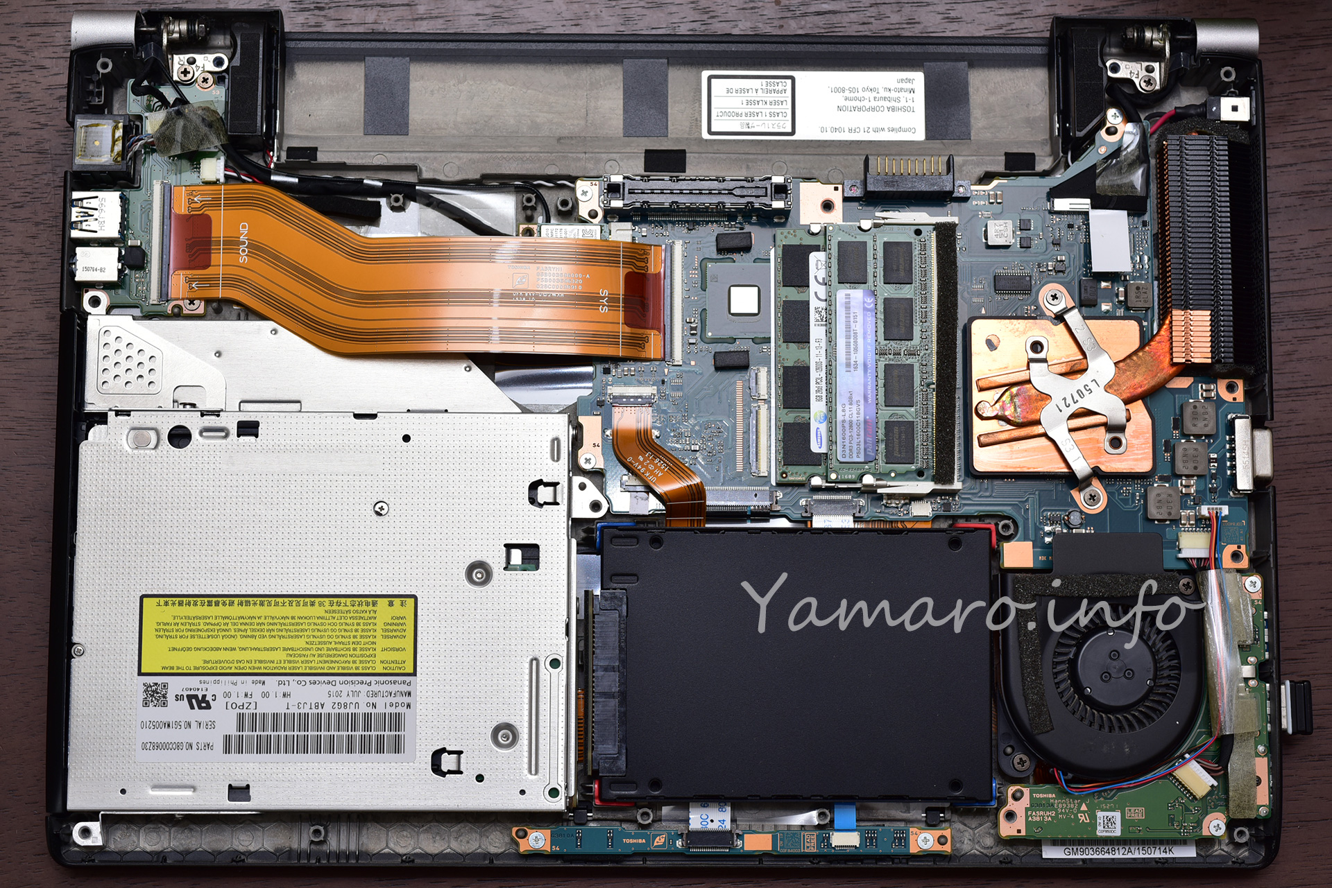 次にDynabook R73を分解します。と言っても、裏返してバッテリを外し、パネルのネジを外すだけで、極めて簡単。Dybanook R73でも、2015年春モデルのR73/PBは、なぜかあまり情報がない機種なんですよね。買ったのはヤフオクの新古品ですが、もともとビジネスモデルでも出ている地味なPCですが、整備性良さとかは、ベースがビジネスPCらしいですね。