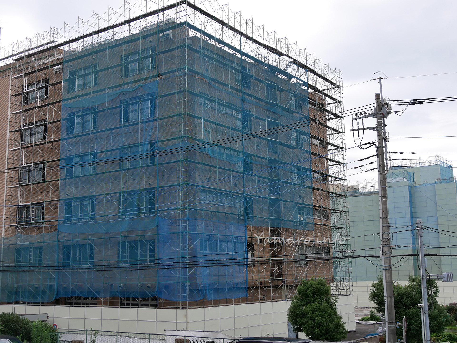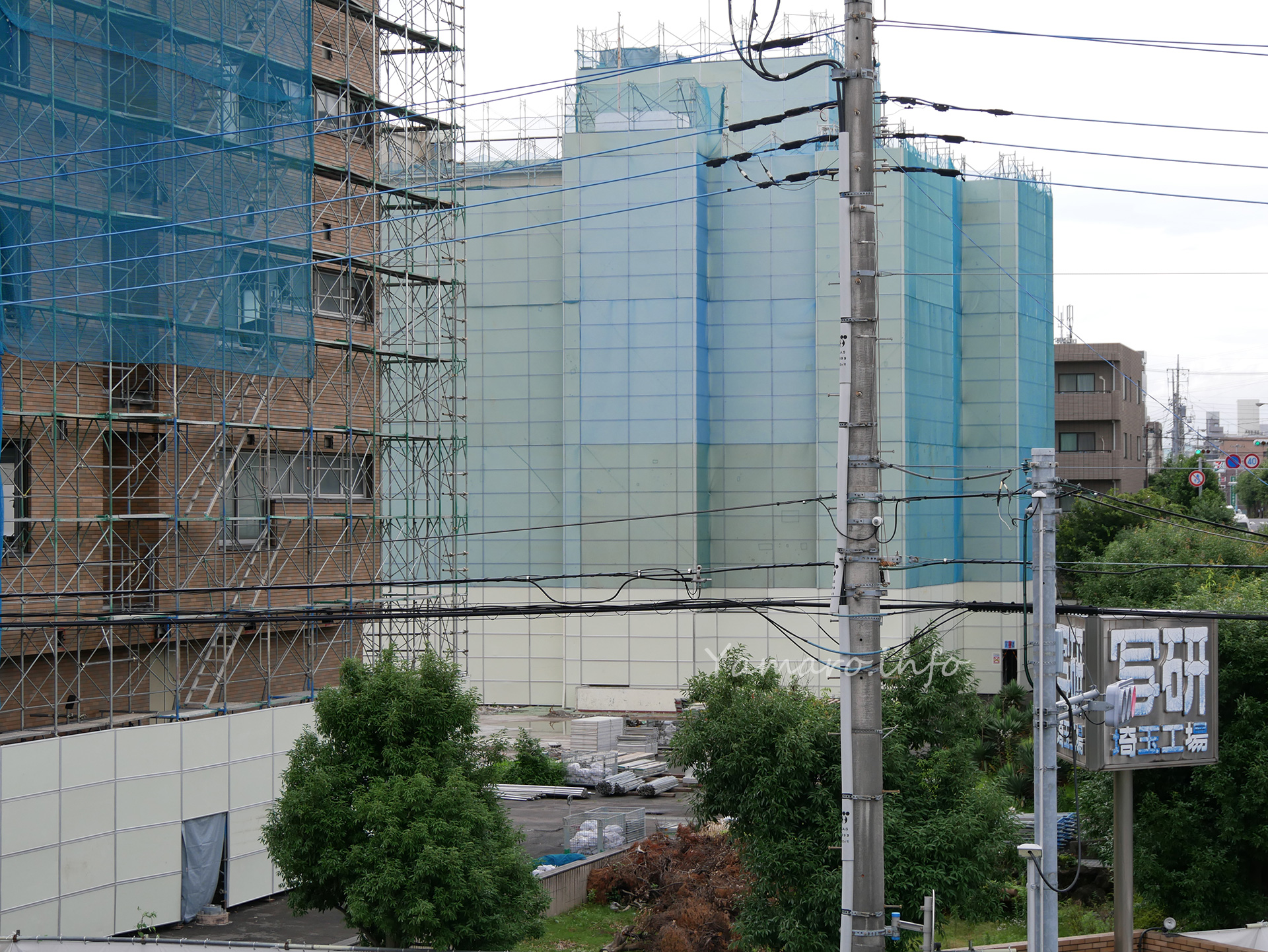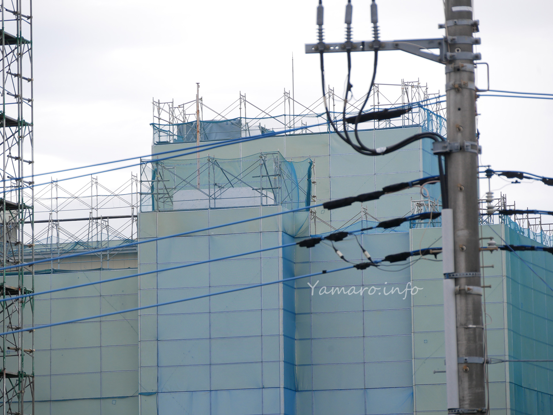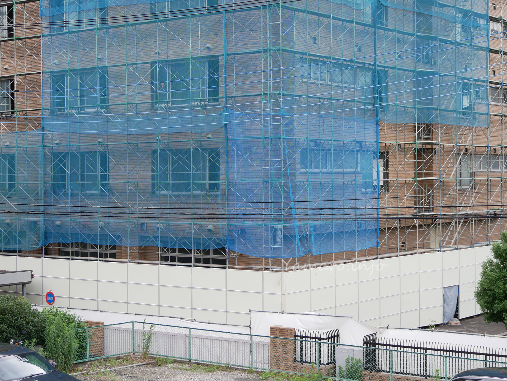 メインビルは大きな変化はありませんが、足場のネットと、1階部分の防音壁はが追加されて、着々と解体準備が進められている様子です。