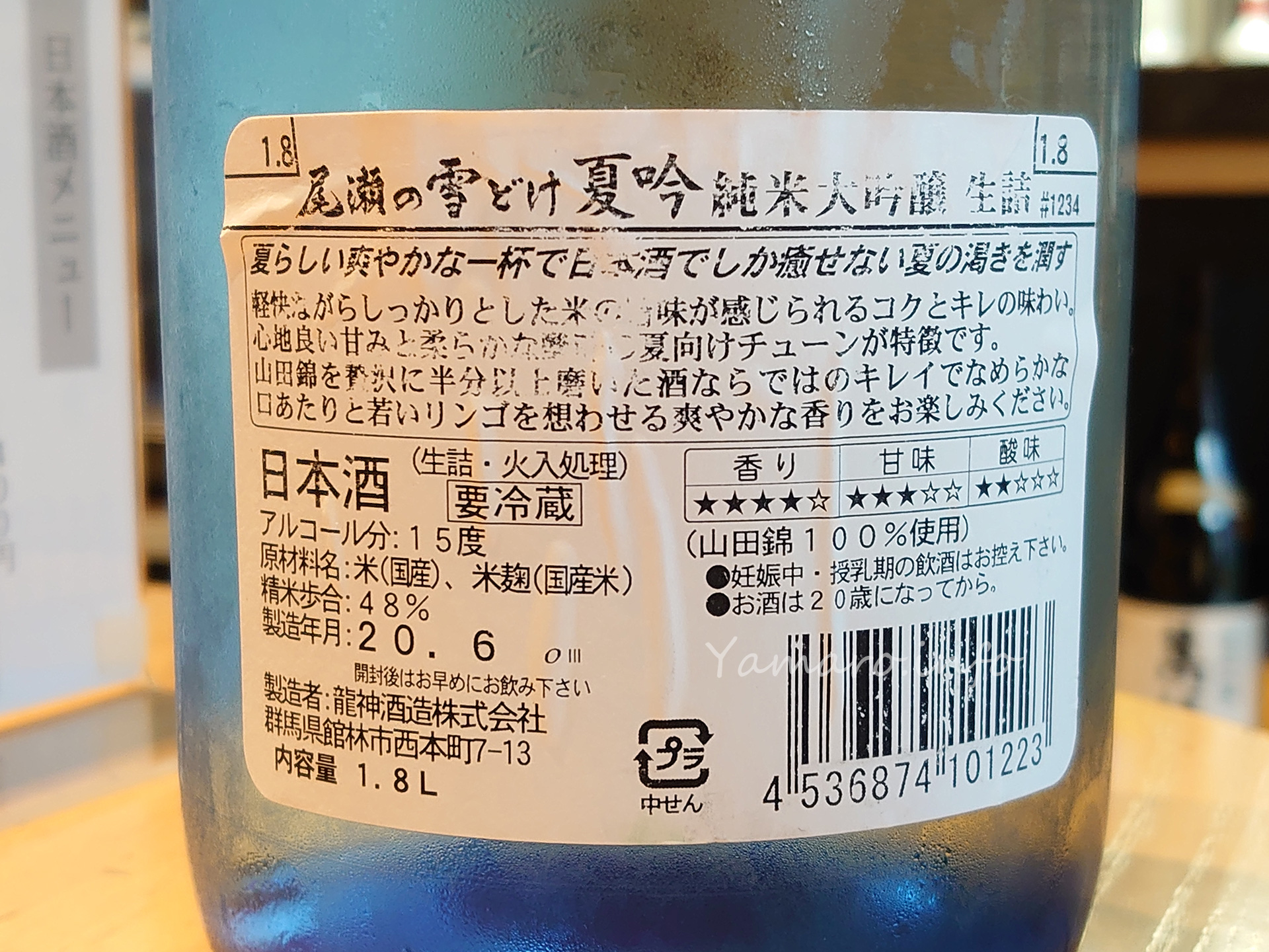 夏酒らしい、本当に爽やかで口当たりが良いです。若いリンゴを思わせる、とラベルにある通り、さっぱりとした甘さと、後味に引く酸味、そして最後はスパッと切れます。いやいや、夏酒は、ともすればさっぱりし過ぎとか、中途半端な味のものも割とあったりしますが、これは爽やかでバランスが良く、後味もスッキリしていて、理想的な夏酒ですね。