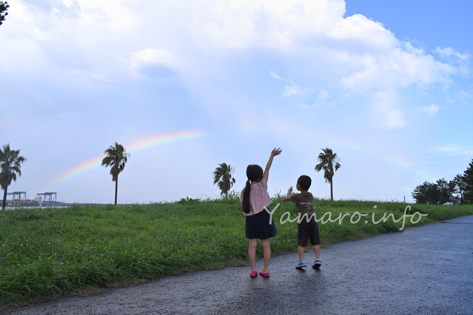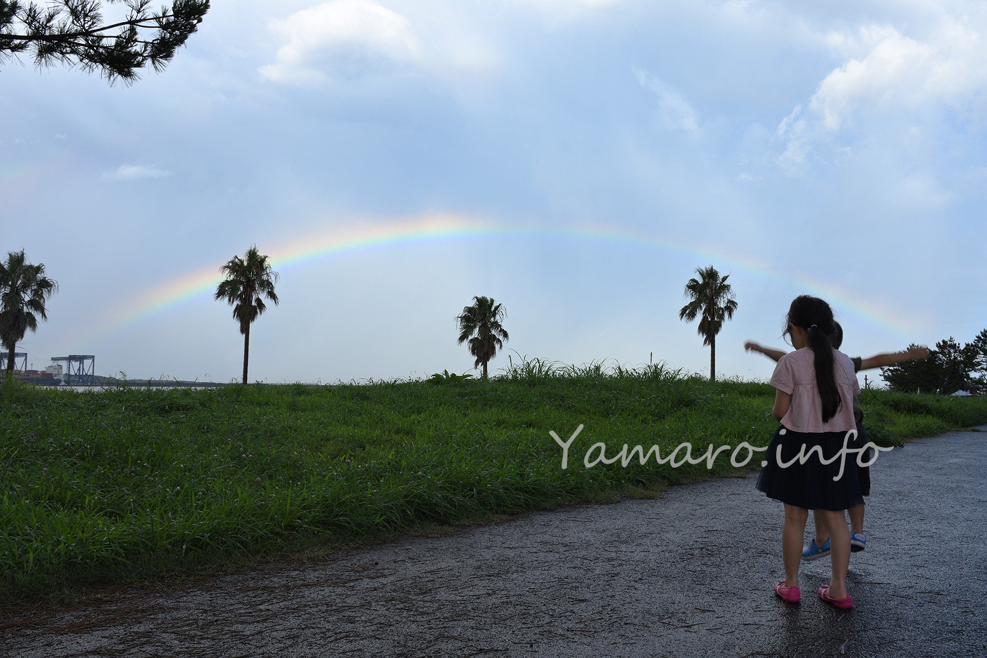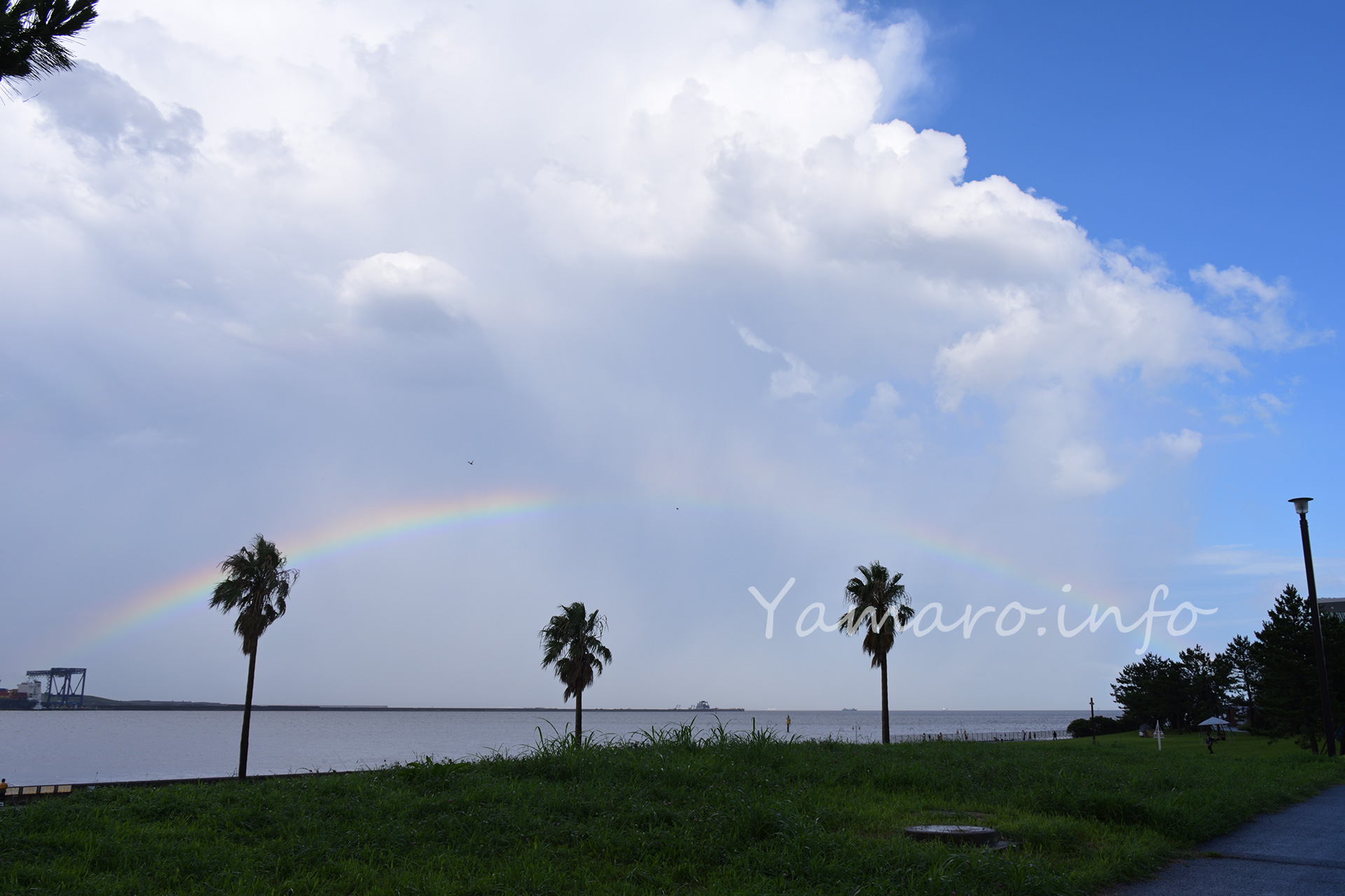 見事な虹! 180度アーチを描く虹はそうそう見れませんよ! しかも結構濃く出ています。そして写真の右側方向から晴れ間が見えるに従って、虹も右側から消失していきます。