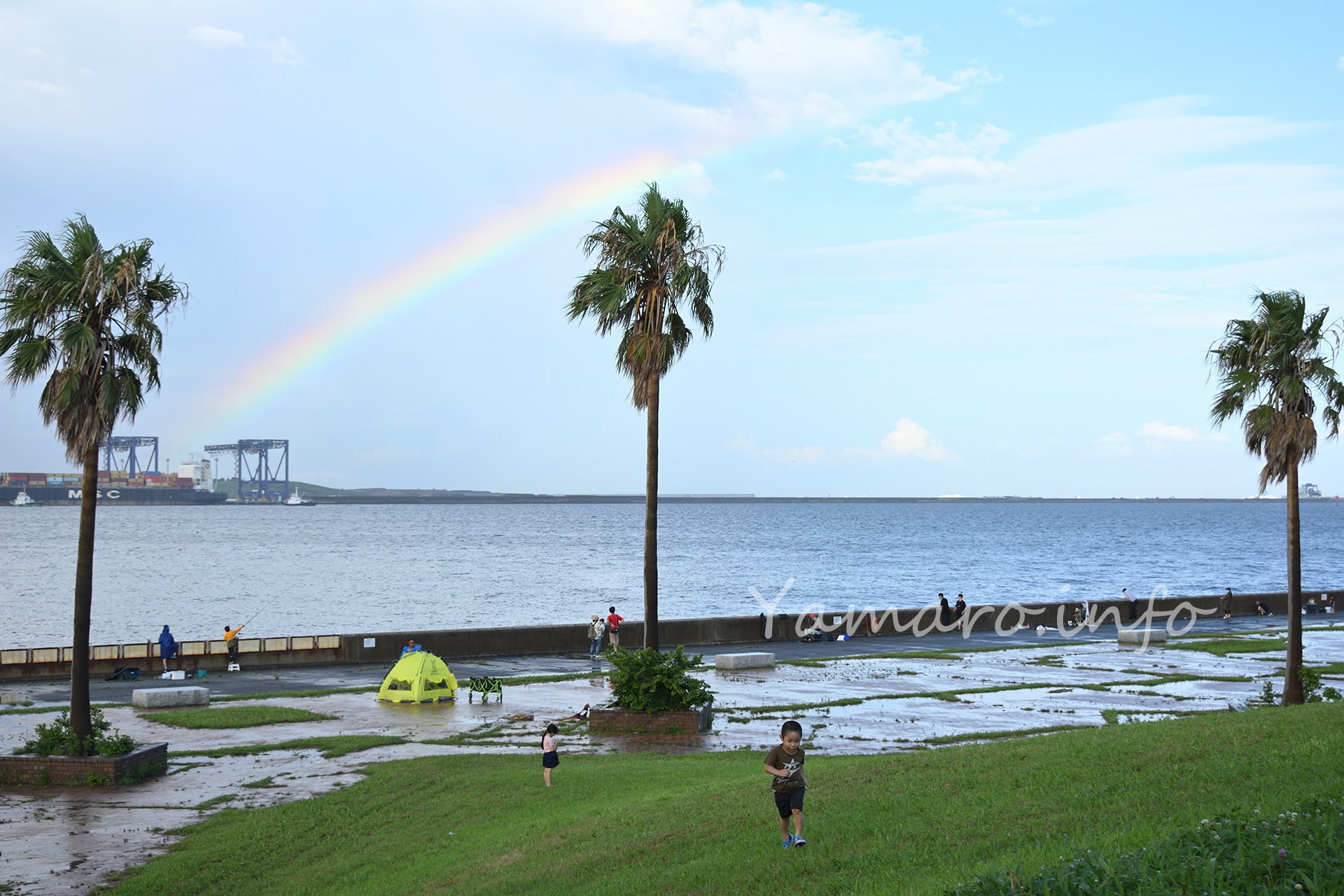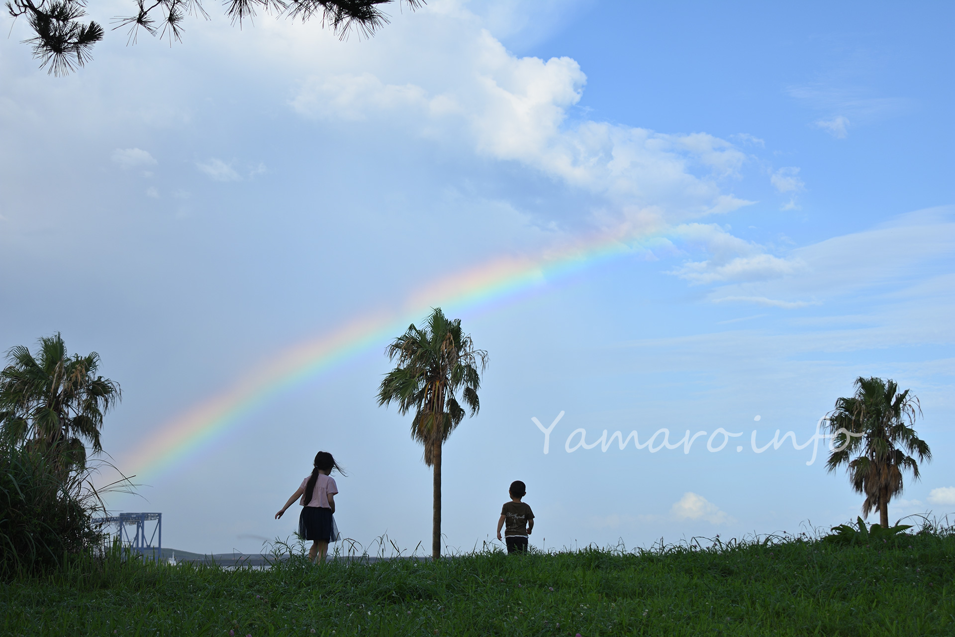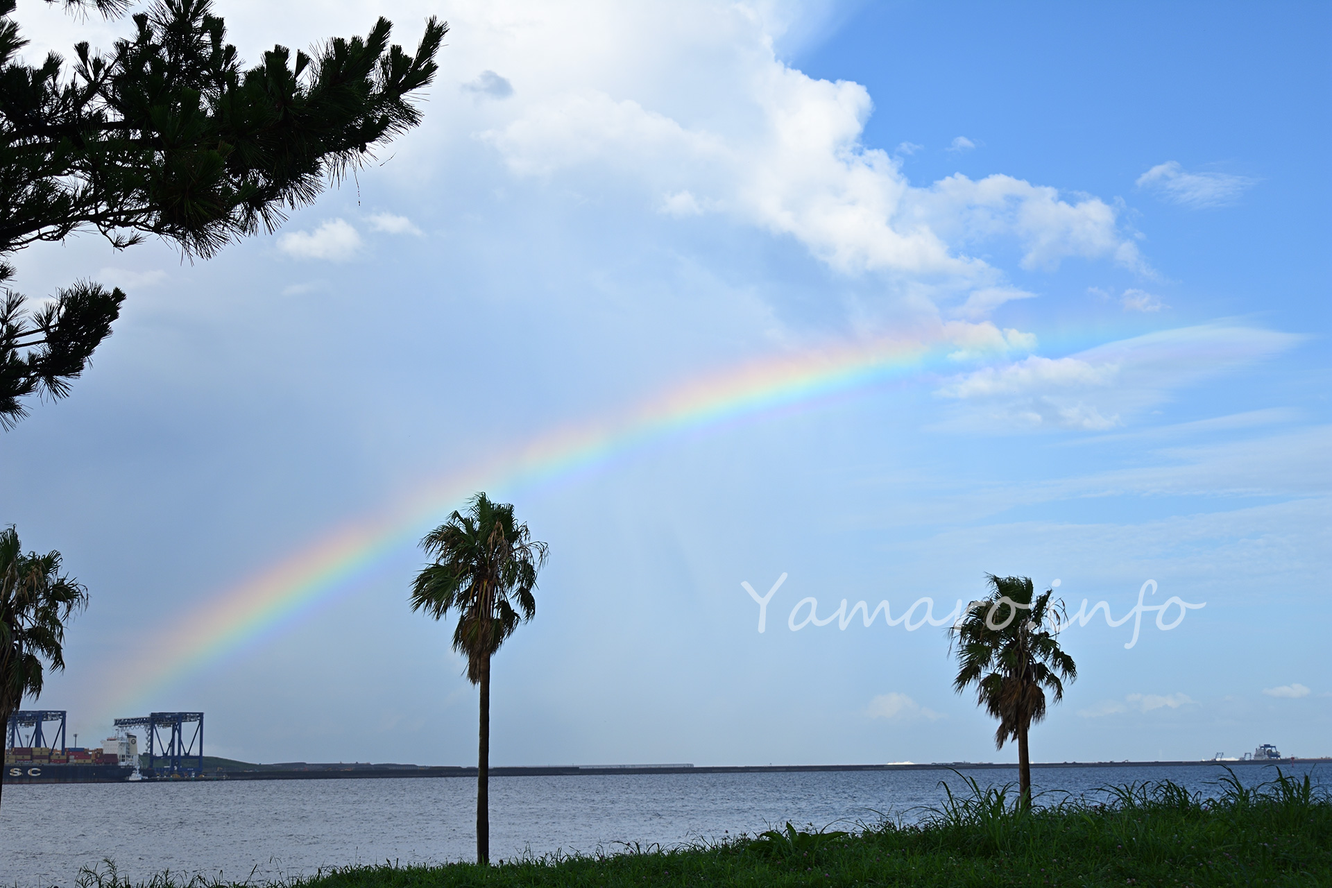 見事な虹! 180度アーチを描く虹はそうそう見れませんよ! しかも結構濃く出ています。そして写真の右側方向から晴れ間が見えるに従って、虹も右側から消失していきます。