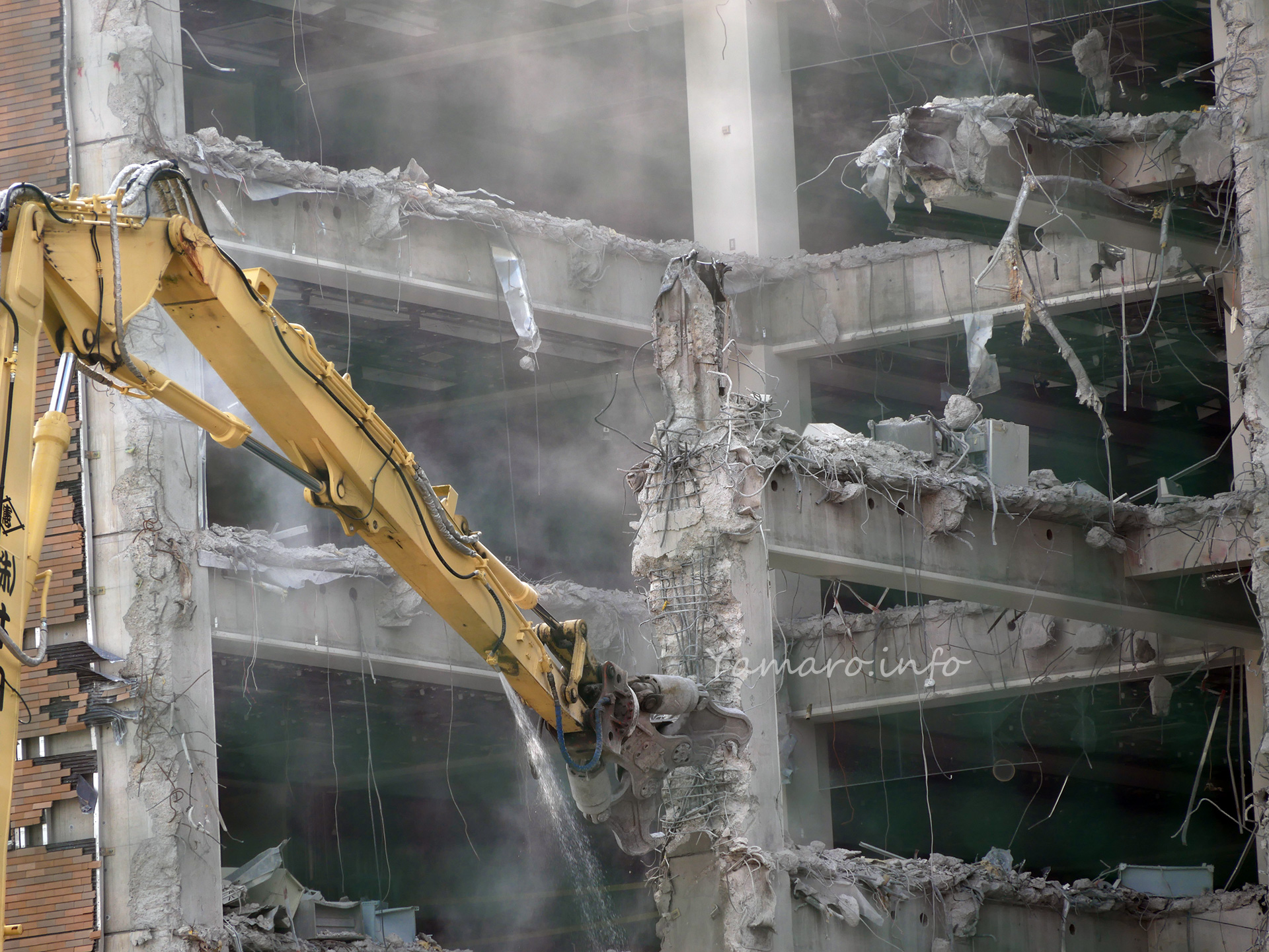 水をかけてホコリの飛散を防ぎつつ、重機の爪が少しずつコンクリと鉄心を削っている感じですね。あんな上まで重機の爪が届くのですね。