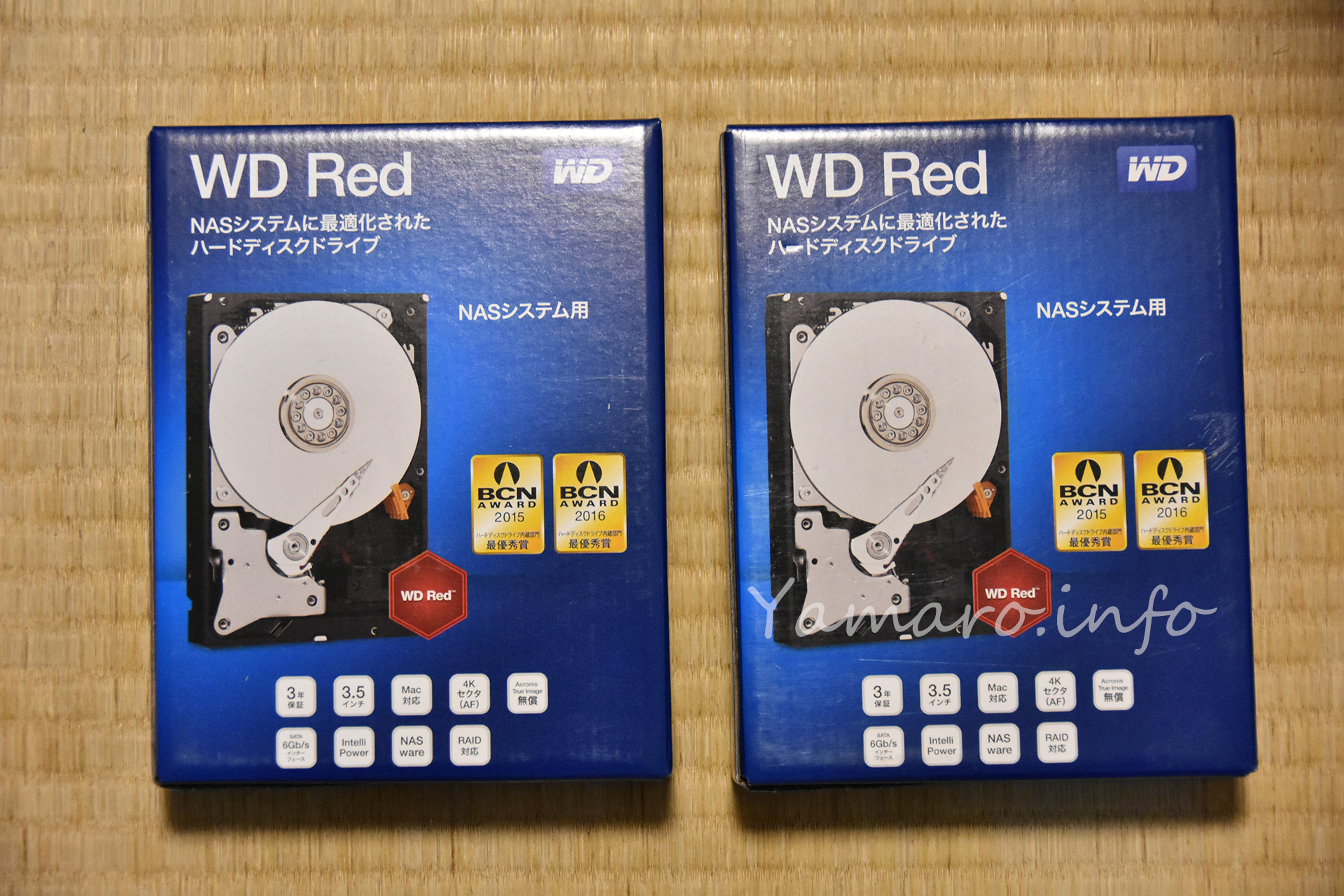 NAS用HDDは、最近は東芝やSeagateからも発売されていますが、WDのほうが安かったもので。