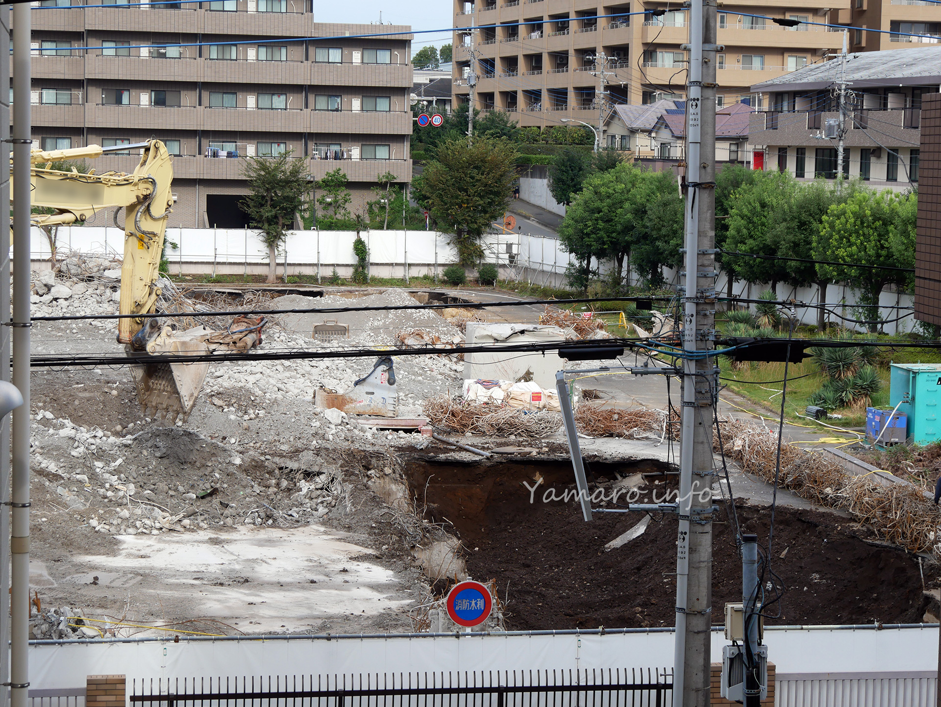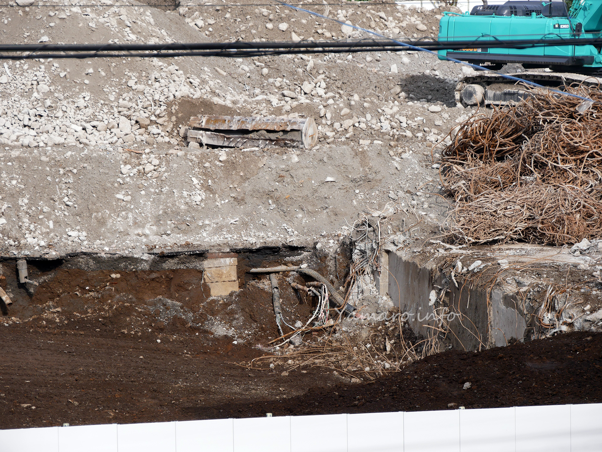 現在の工事工程は「基礎解体、廃材搬出」となっていて、地中部分の基礎を掘りながら解体し、コンクリートや鉄くずを搬出していて、このときもダンプカーがひっきりなしに出入りしていました。