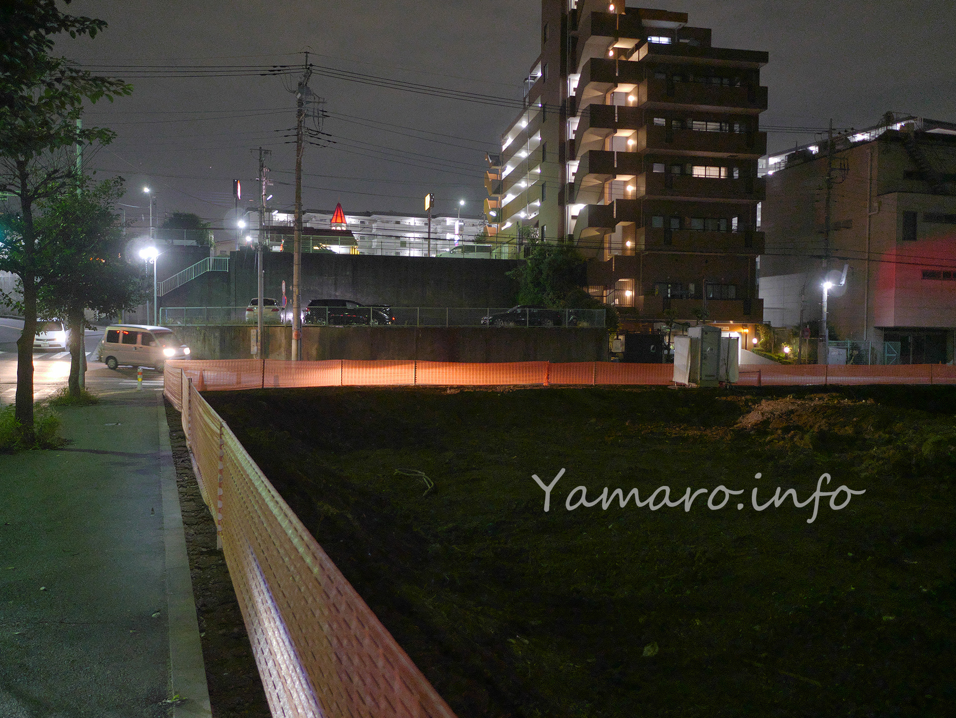 確かに朝には健在だった「写研埼玉工場」の看板、日中に撤去されたのでしょう。夜にはご覧の通り、交差点の角にあった看板は、外壁ごと無くなっていました。