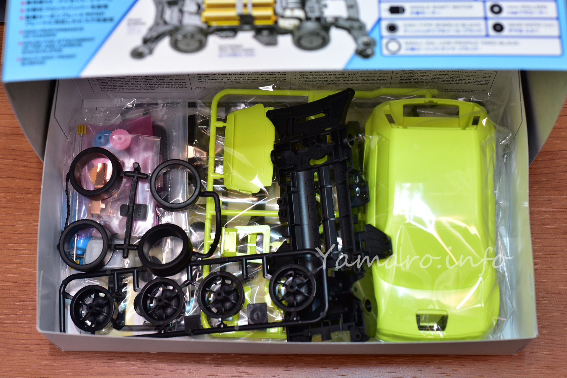 ミニ四駆なので、ニッパーがあれば、接着剤も塗料も必要なく作れます。作るのは週末かなぁ。