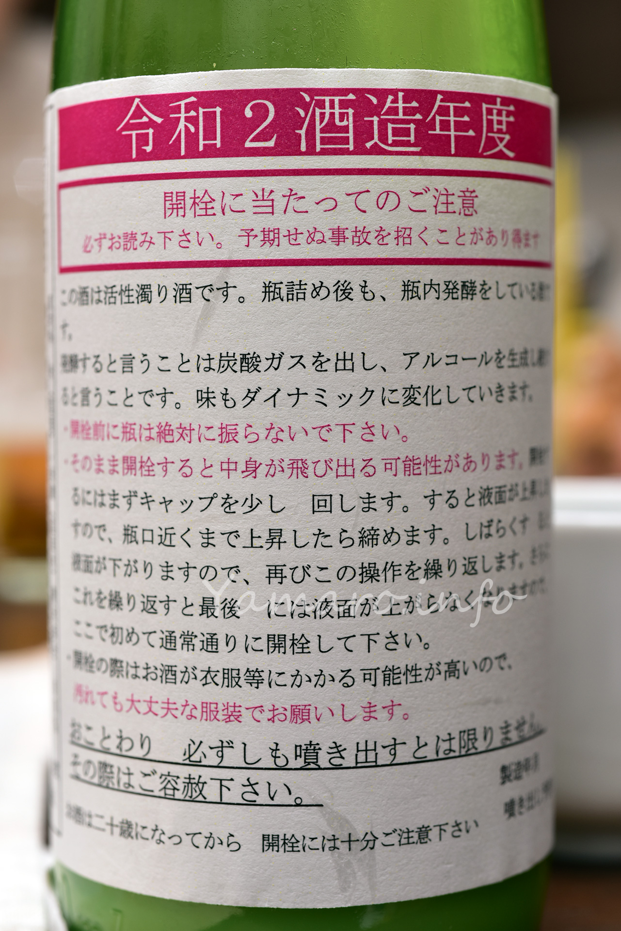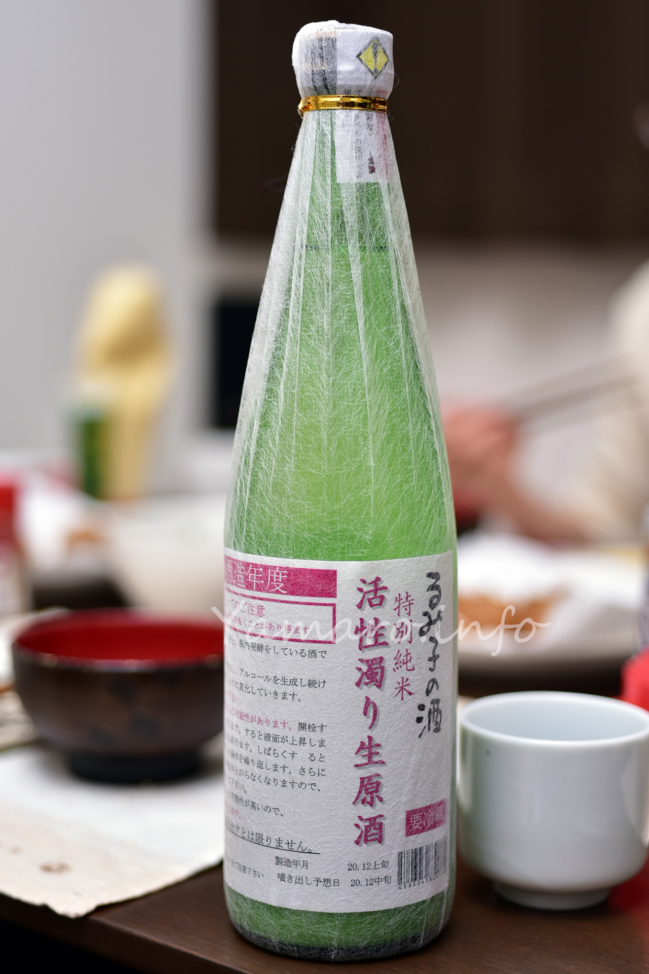 なんでもこのお酒、結構テレビで紹介されて、吹き出すパフォーマンスのイメージが付いているようですが、発酵状態は瓶それぞれ、自分の買った個体は、多分一気に開けるとお酒は漏れそうだけど、高く吹き出す、という感じまではなかったですね。