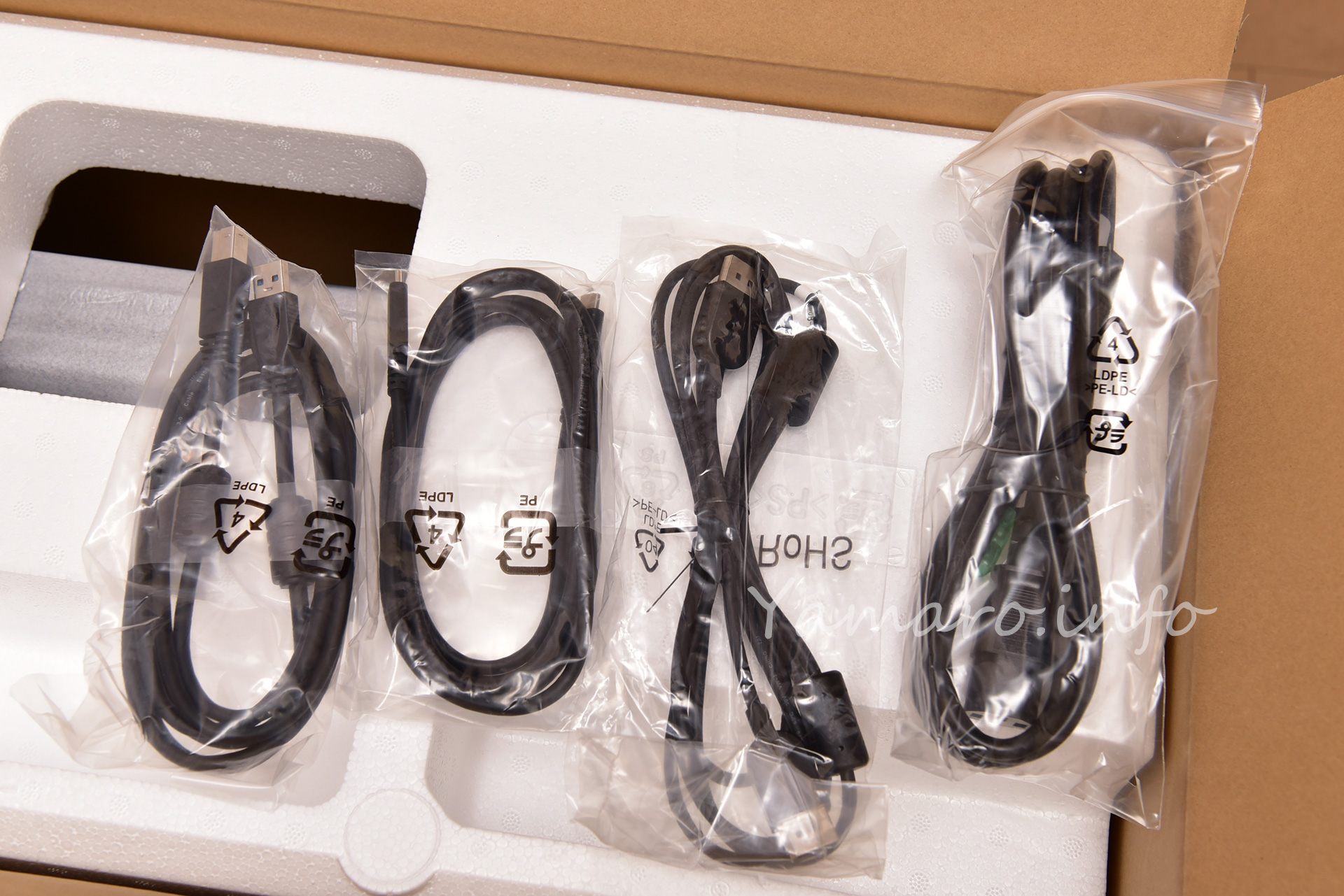 ケーブルは一通り揃っています。推奨は1本で通信と映像入力に対応できるType-C接続のようですが、入れているグラボのQuadro K2200は少々古いので、DisplayPortで接続します。別途、USB Type-Aも接続します。