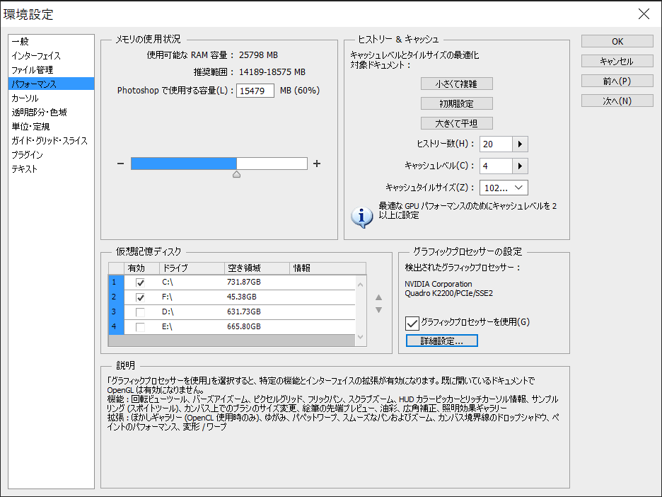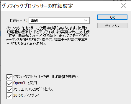 Photoshopの場合は、環境設定→パフォーマンスで、グラフックプロセッサーの設定から詳細設定を選択します。