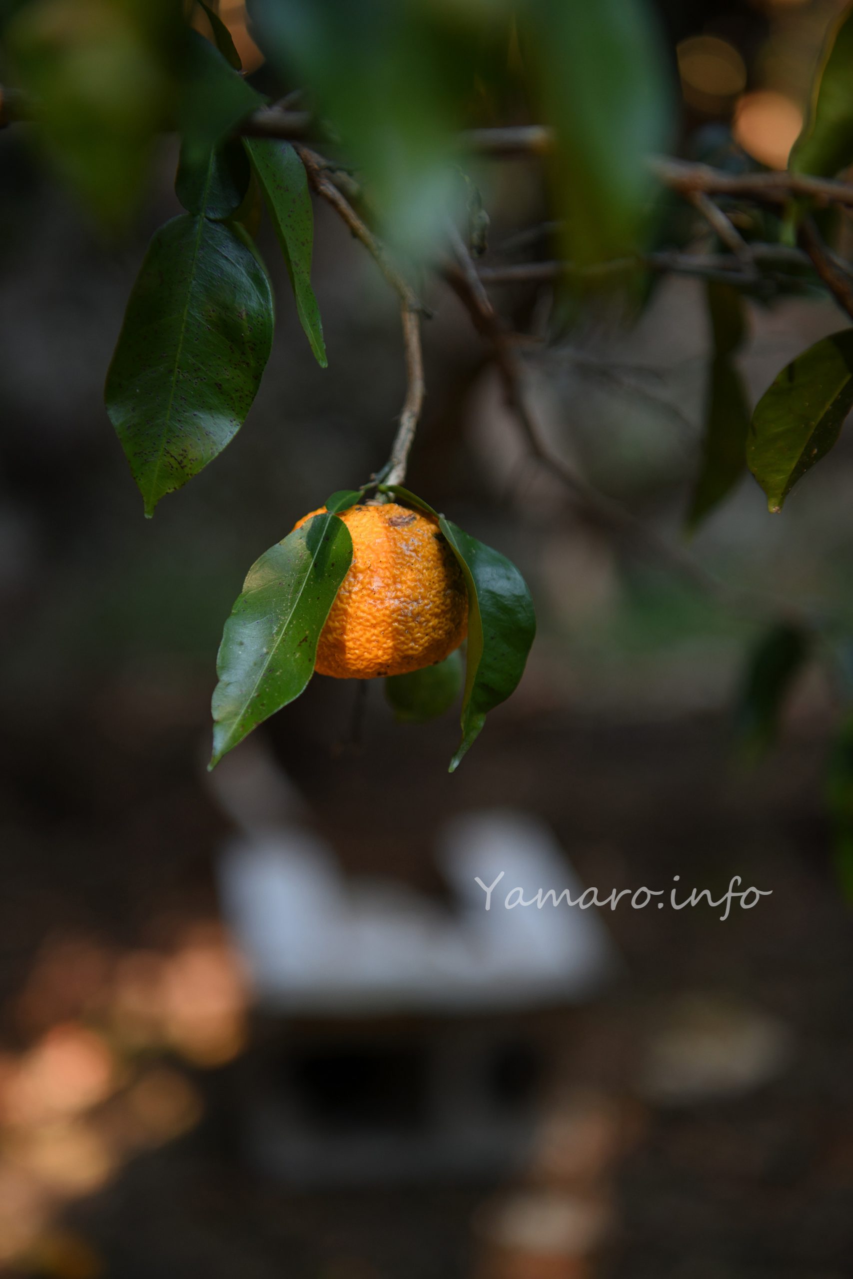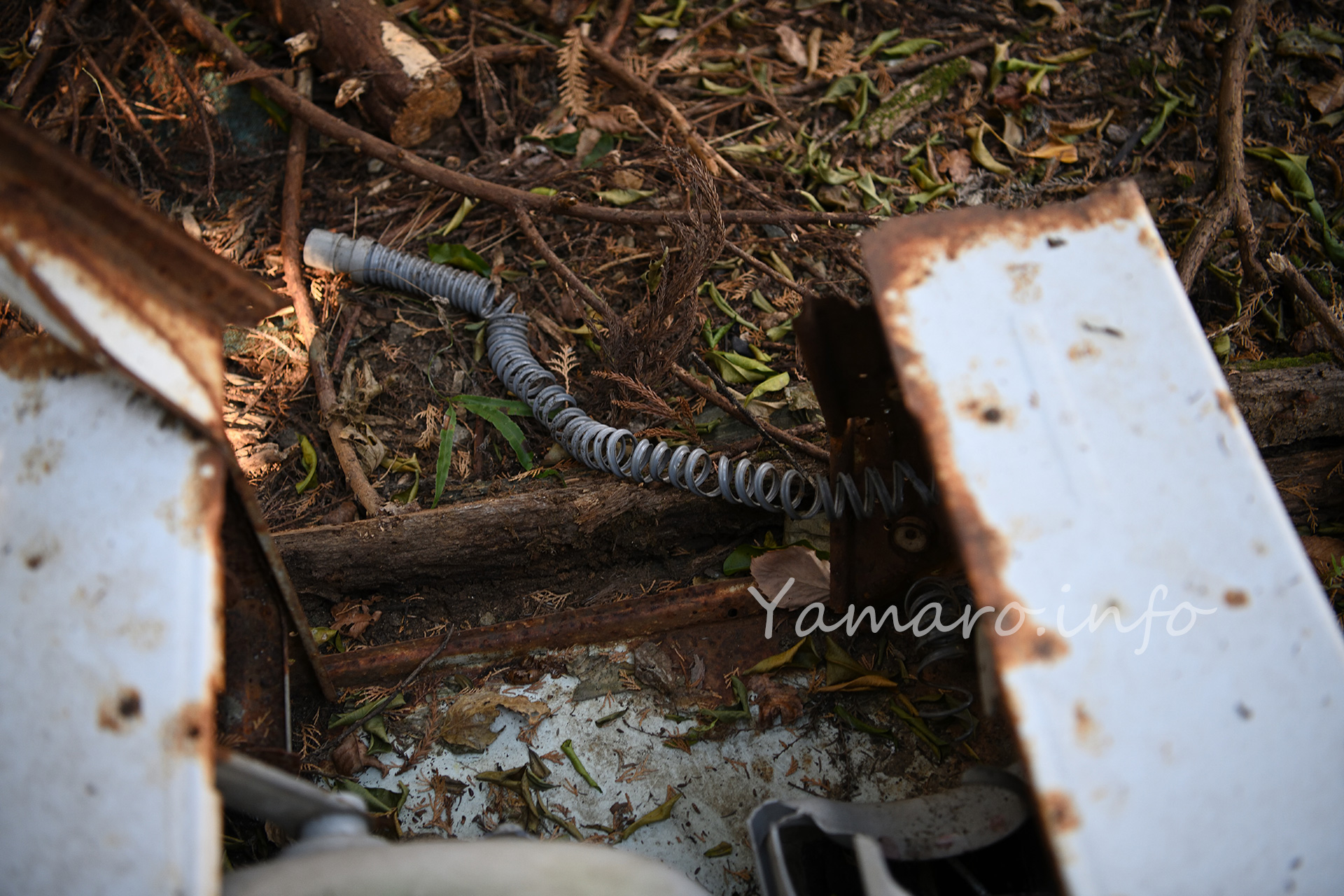 懐かしい2槽式洗濯機が転がっていて、その上には柚子?が生えていました。洗濯機のホースが劣化て、カールコードのように。
