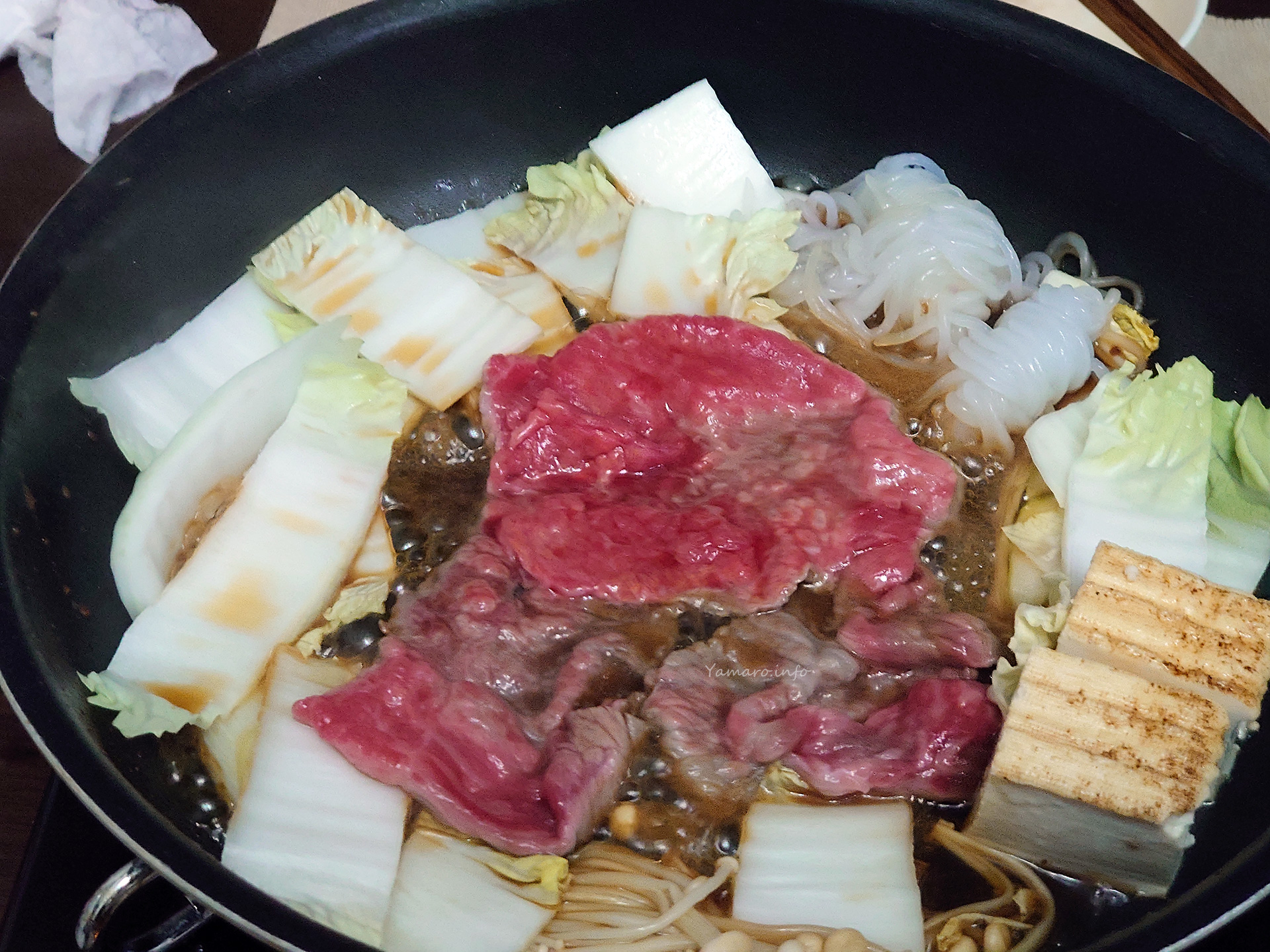 近江牛のすき焼きです。近年は高級牛肉と言えば「松阪牛」のほうが有名ですが、近江牛のほうが和牛としては歴史が長く、江戸時代から食べられていたそうです。