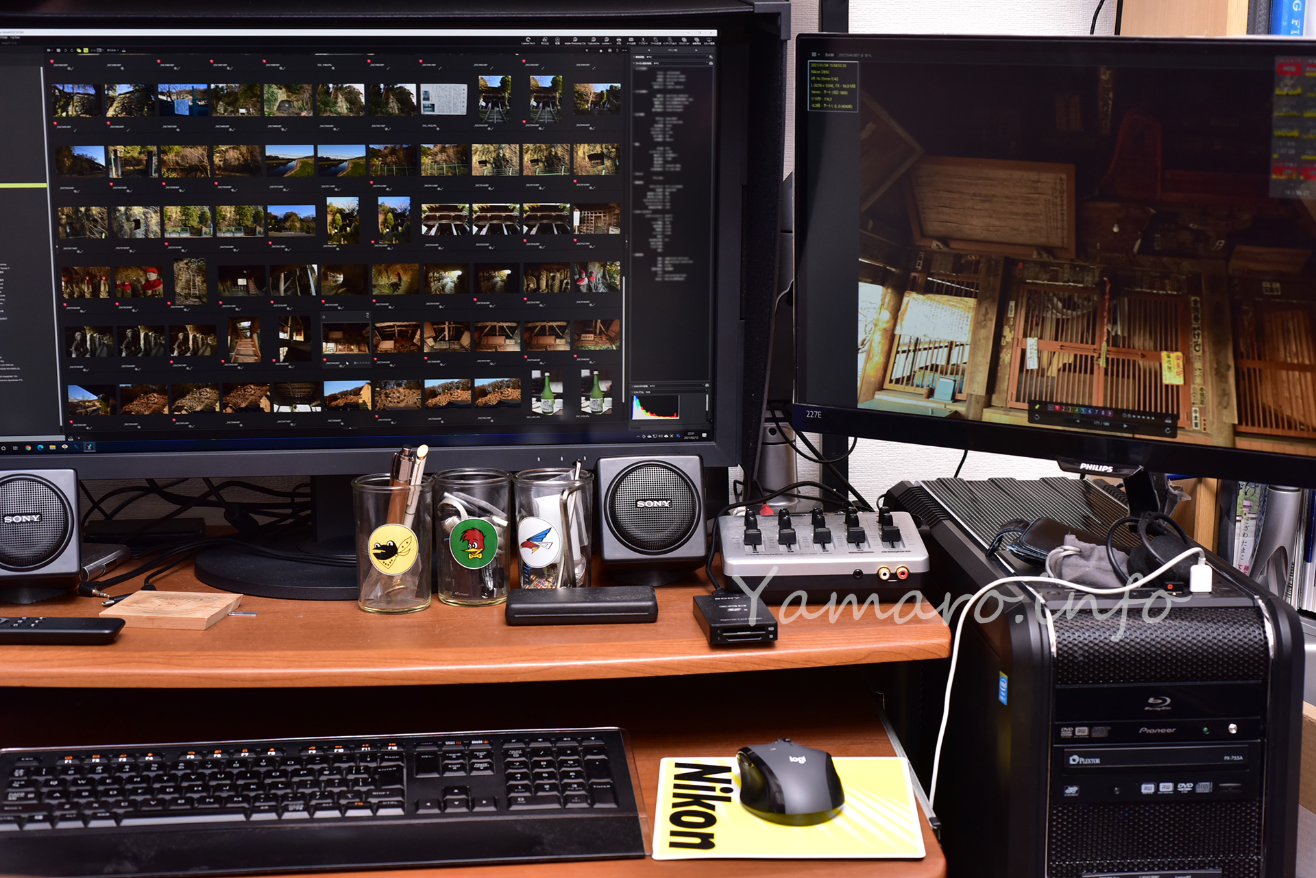 アームを設置している場所にこれまで置いていたサブウーファー(30年以上前のSONY BeSIDE DOGA SRS-D3)は、モニタの裏に設置しました。このスピーカーも、デッドストックをハードオフで買ってからもう13年使っています。