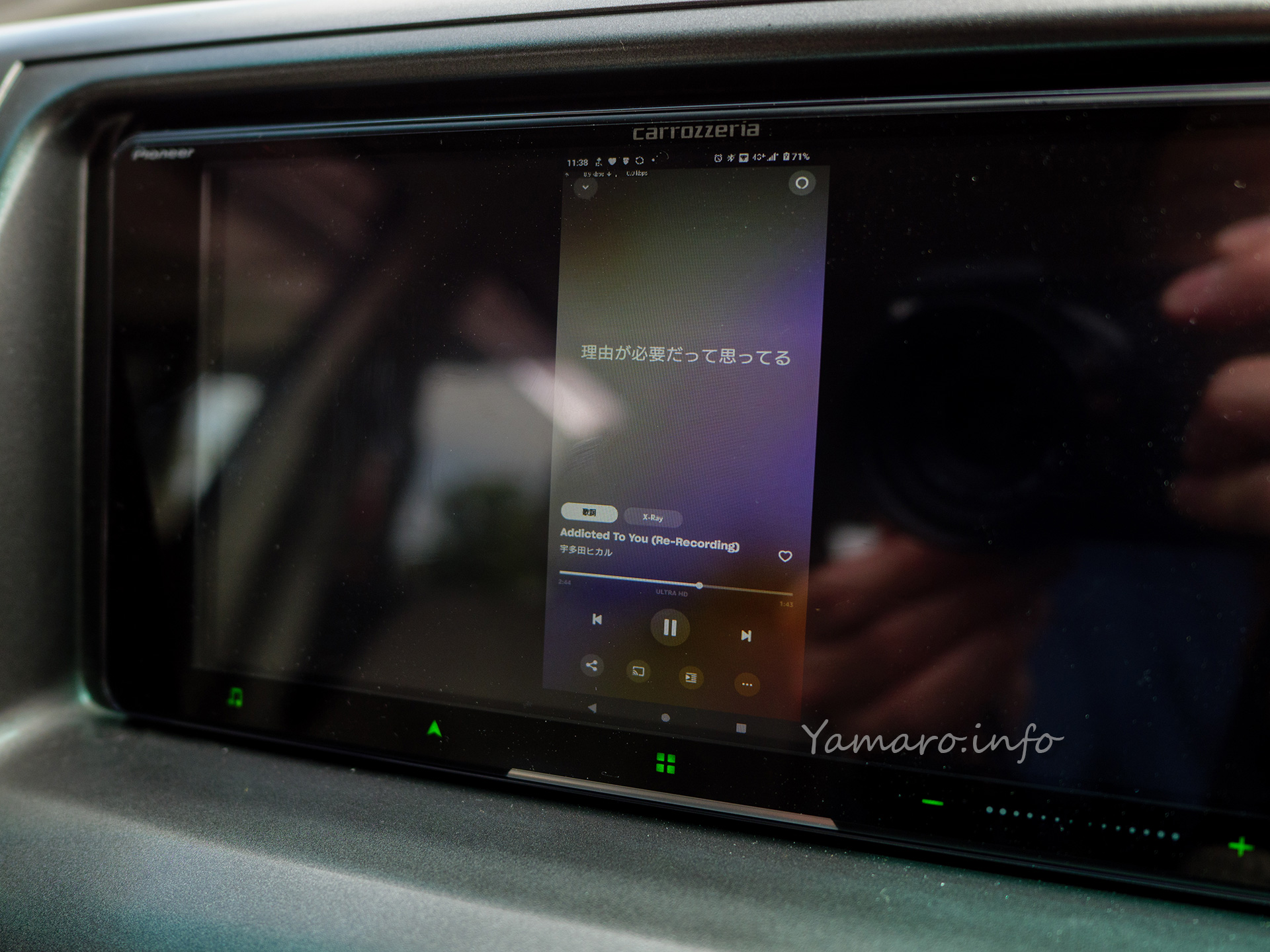 事前に自宅のディスプレイでHDMI出力できることは確認しているので、クルマでも問題なく接続できました。ミラーリングなので、スマホが縦だとミラーリング先も縦の画面に。さてちゃんとハイレゾ接続できているかな? ナビ側では確認できないため、Prime Music側のソフトで確認しましょう。