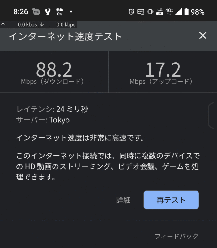 これにより88.2Mbpsのダウンロード速度が出ました。概ね満足な速度ですね。