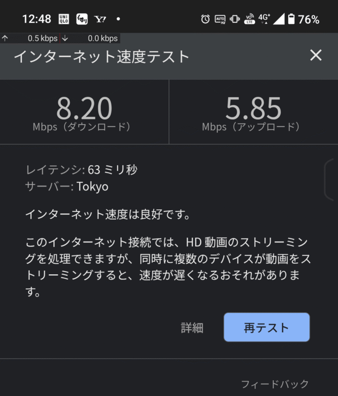 そして懸案だった職場の昼間の速度。流石にお昼時は速度低下するものの、安定して5~10Mbpsの速度は出るようです。