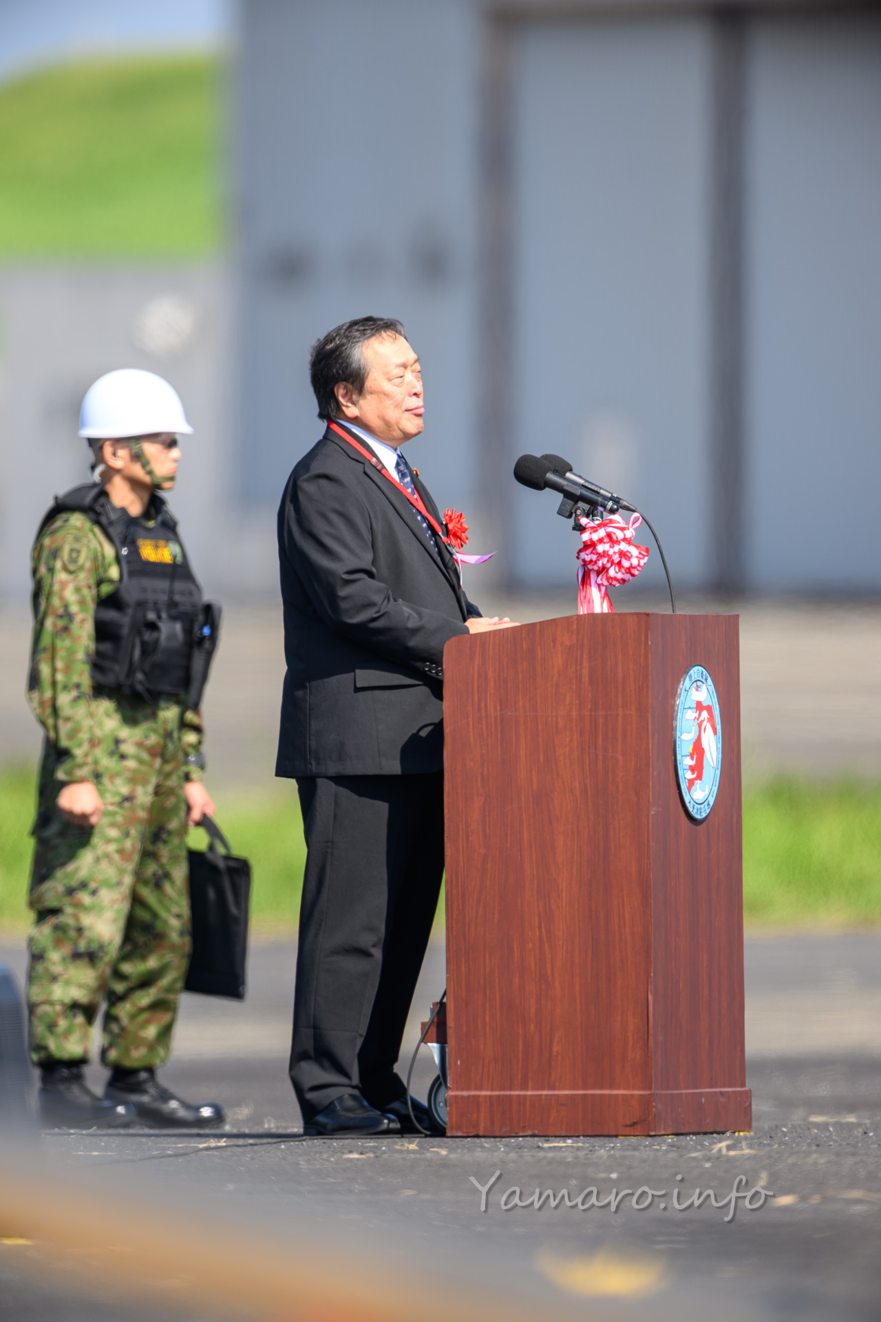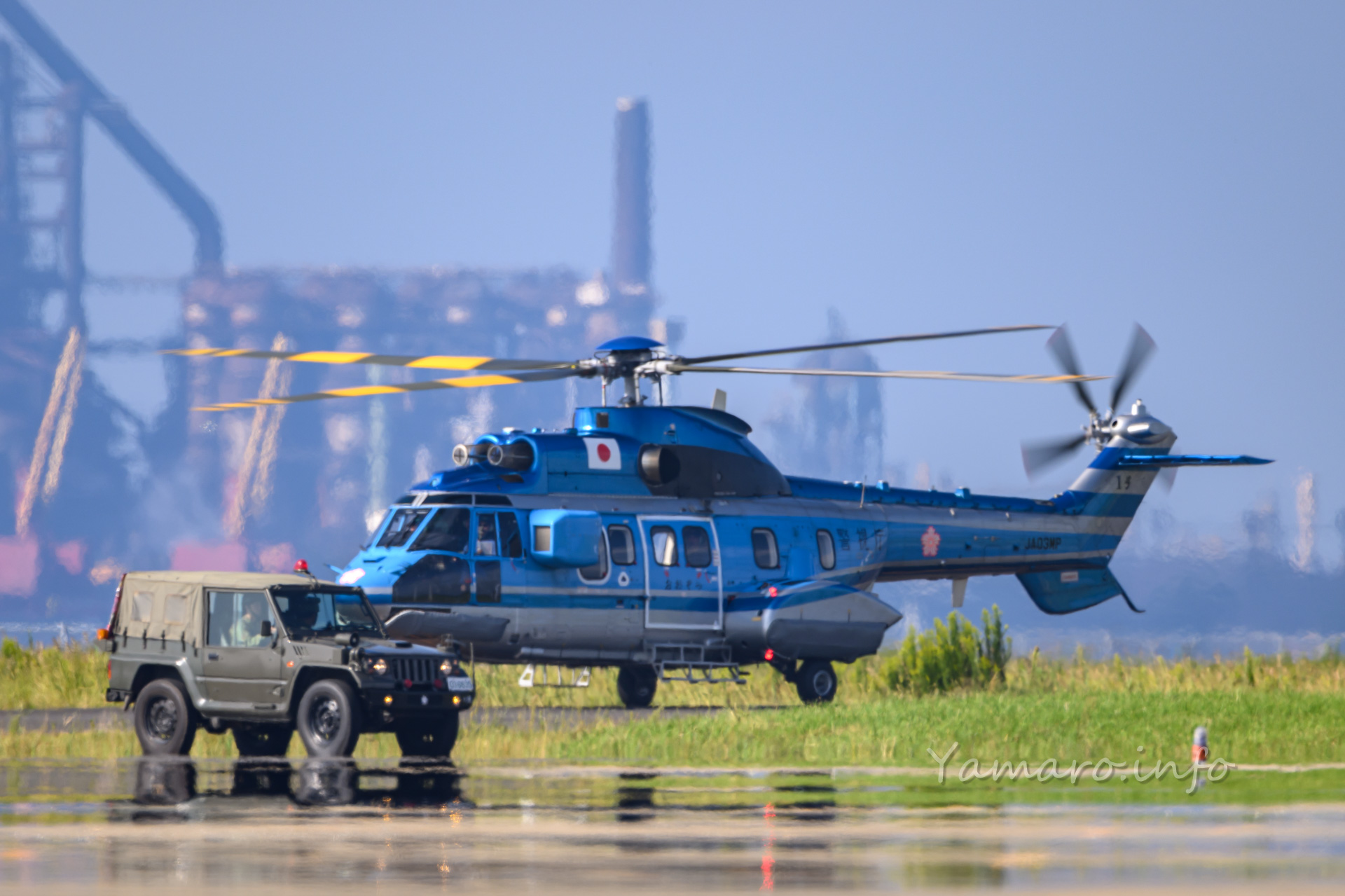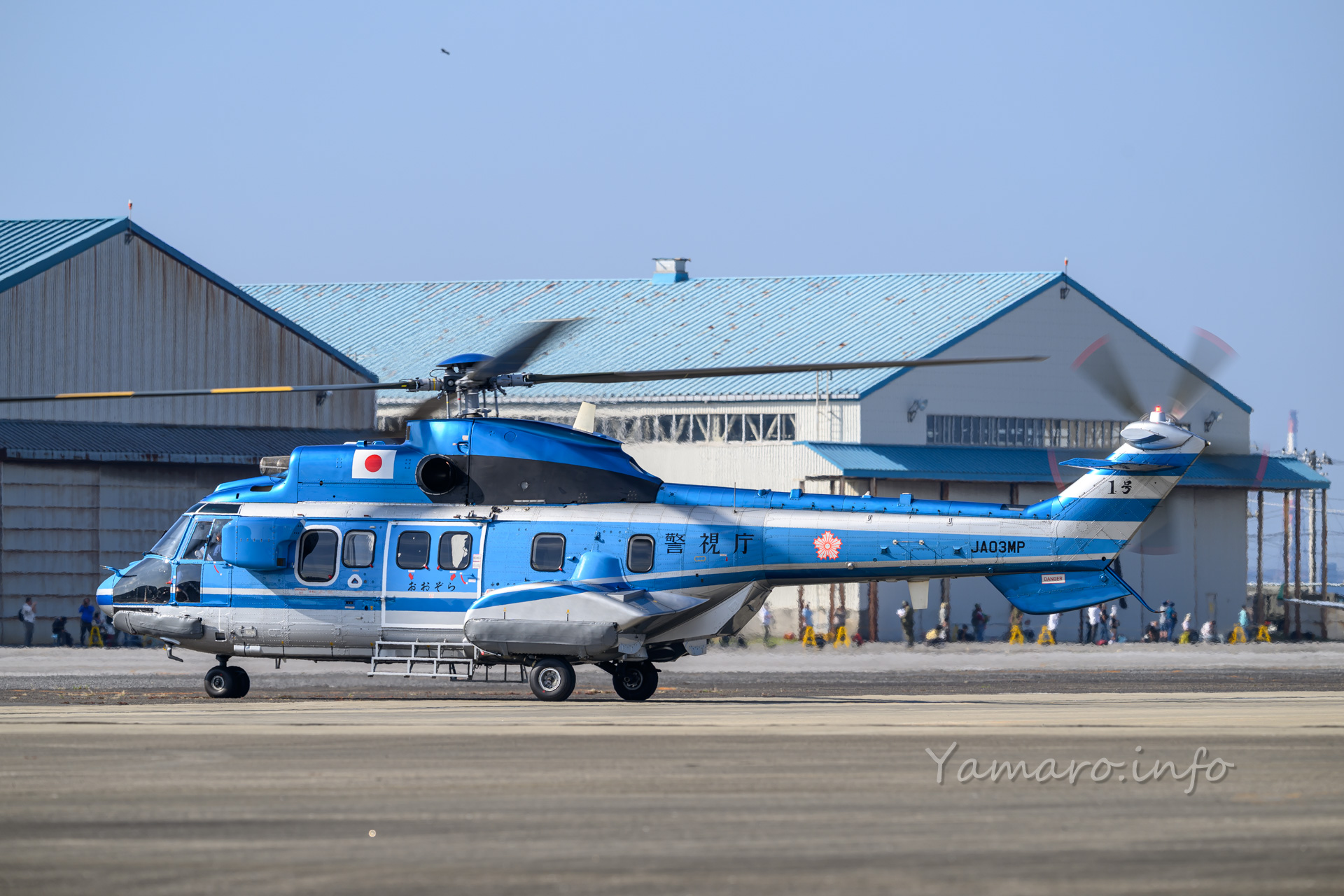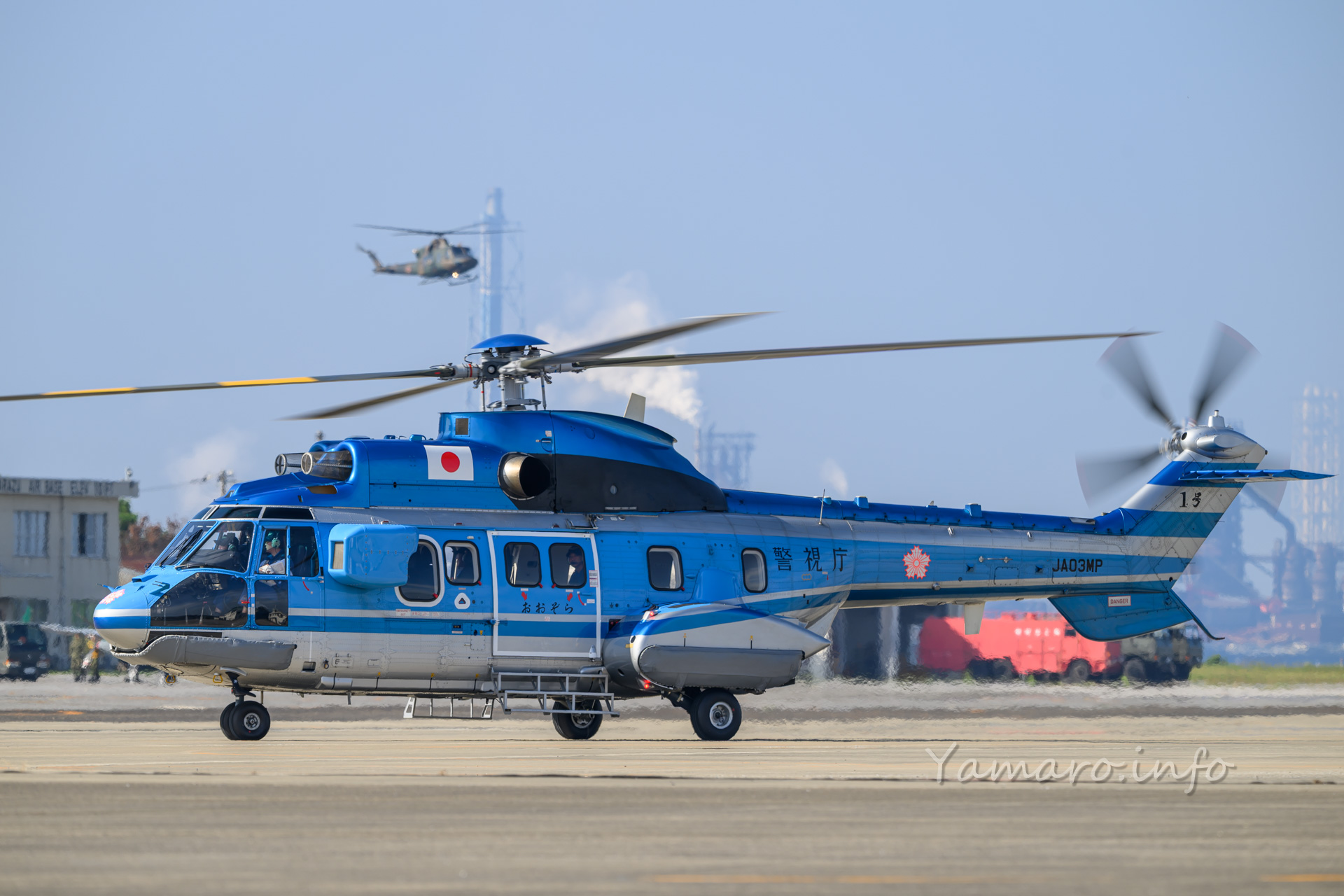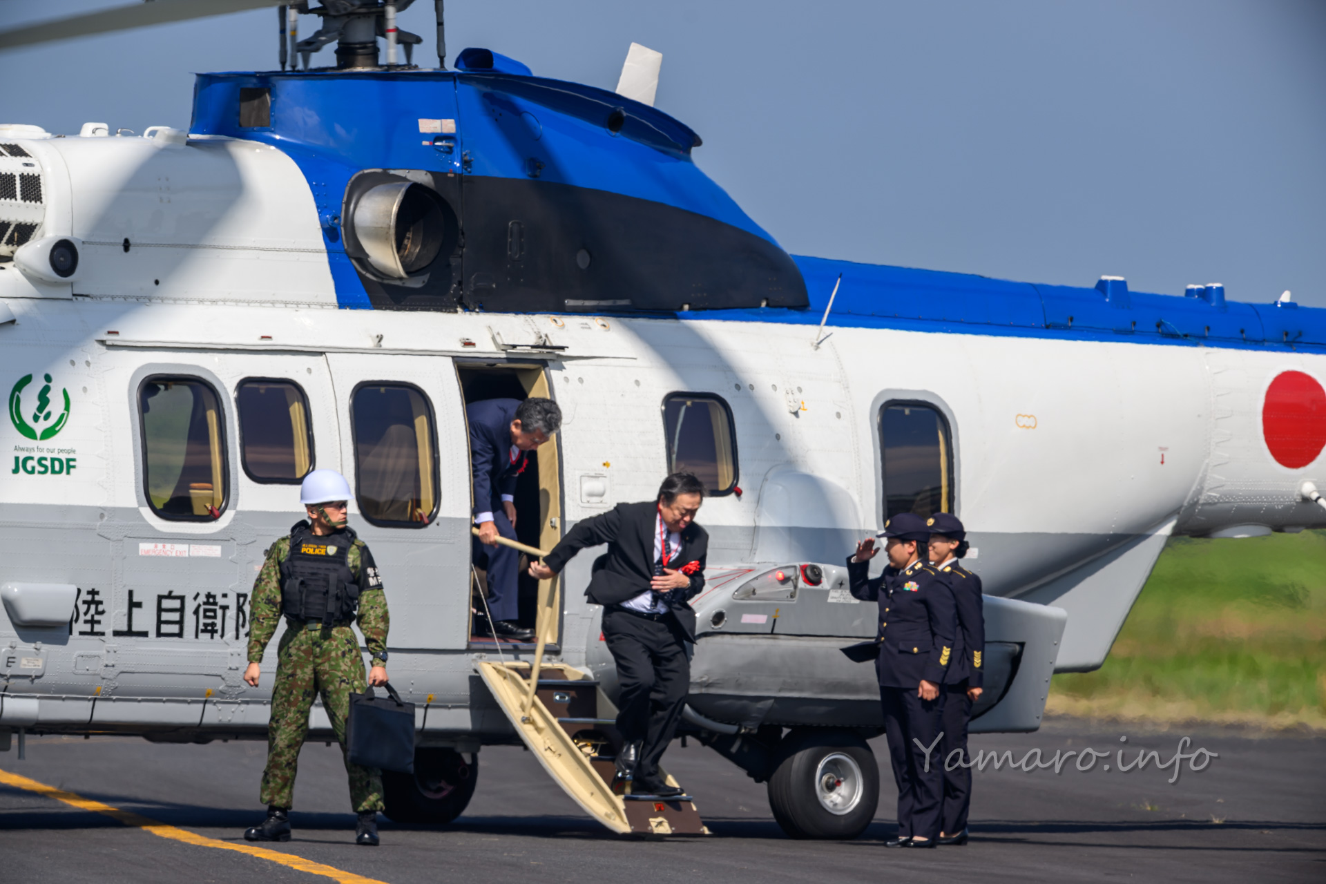 式典会場は去年と違う場所でしたね。式典が始まり、EC-225LP スーパーピューマMK.Ⅱ+が降りてきました。と言ってもちょっと向こうから上がって降りてきただけですけどね。