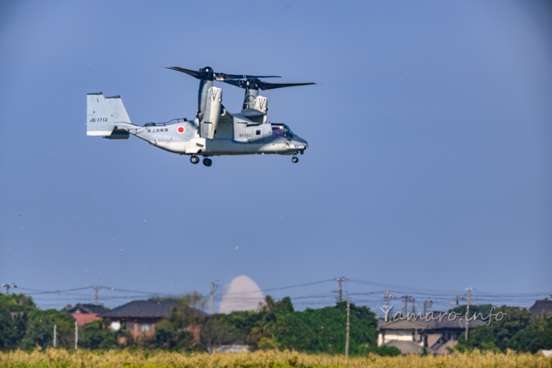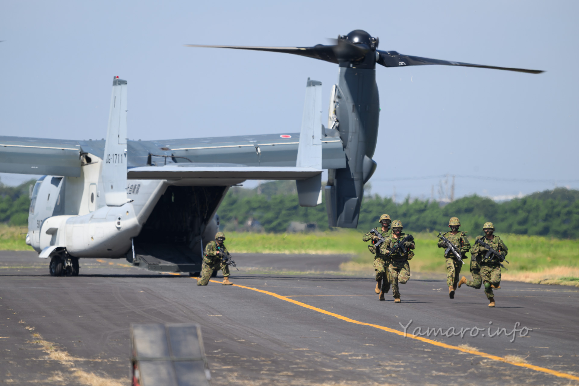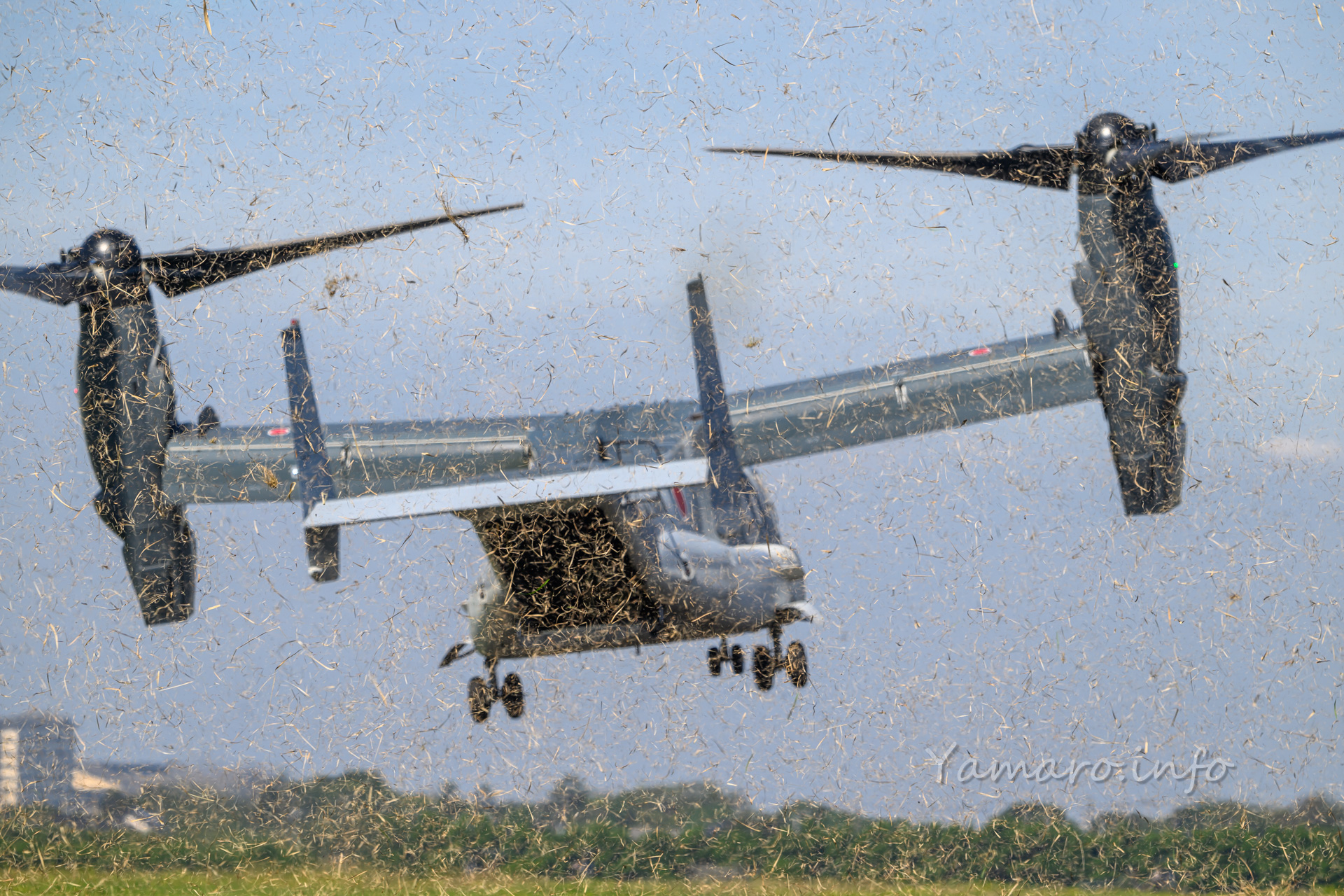 オスプレイは今年は数が少ないものの、しっかり人員輸送の展示を披露。枯れ草が大量に舞いカメラのフォーカスが持っていかれるw