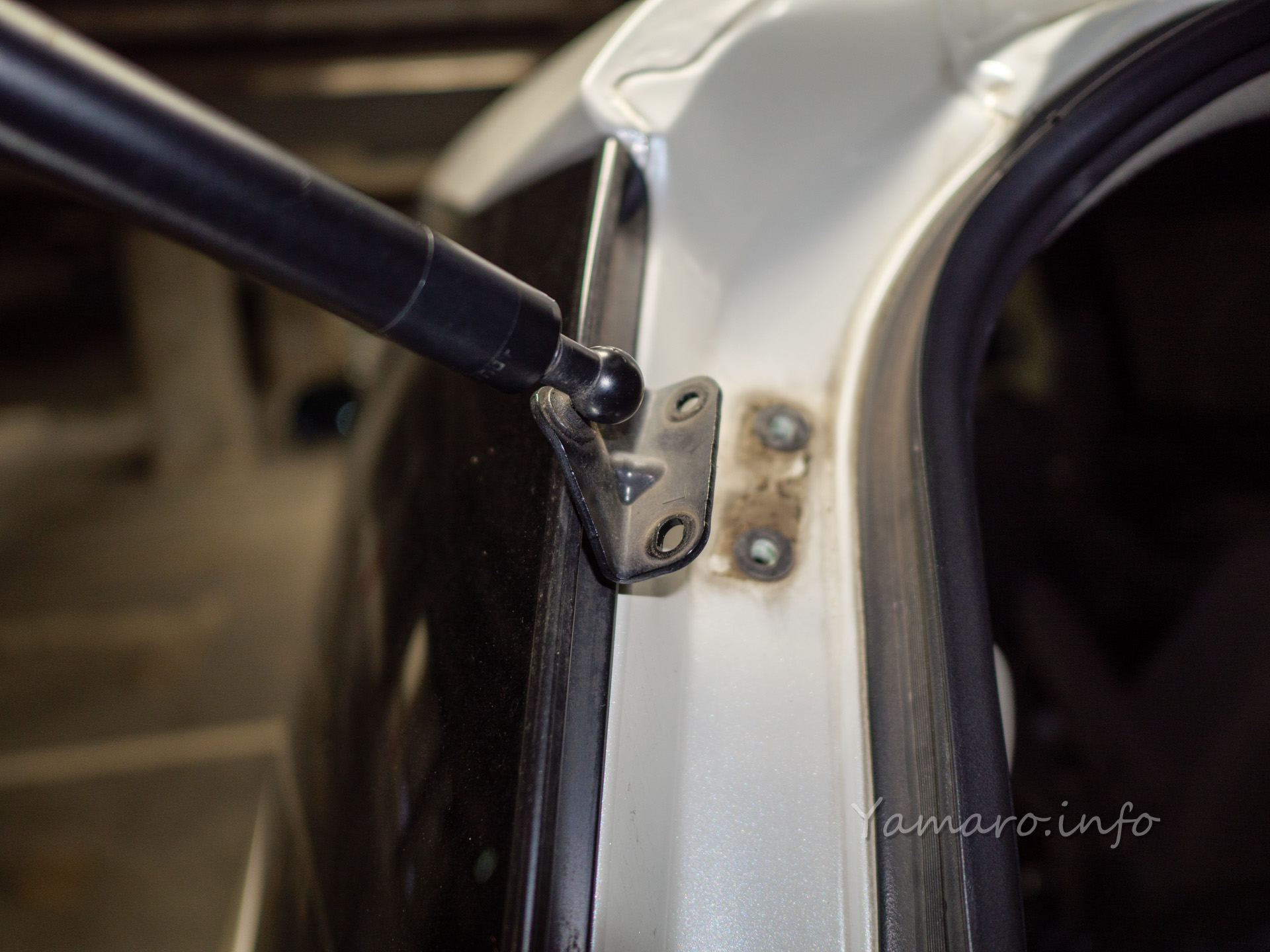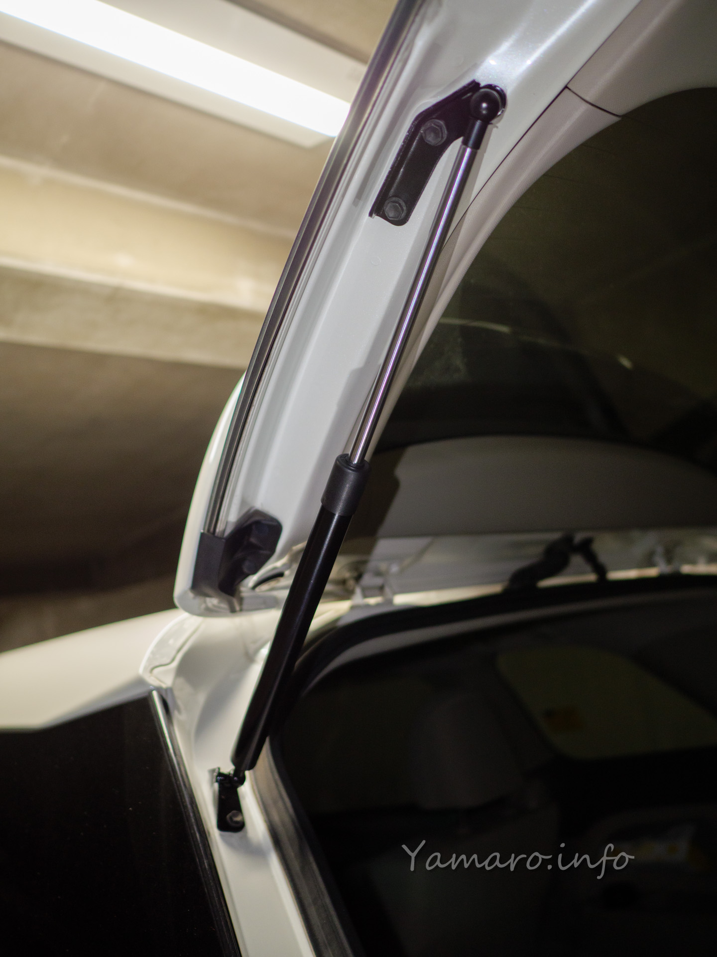 取り付けはコツが必要です。そのまま付けようとすると穴位置が合わないです。リアゲートを支えているとは言え、片側を外したことで少し下がっていたようです。