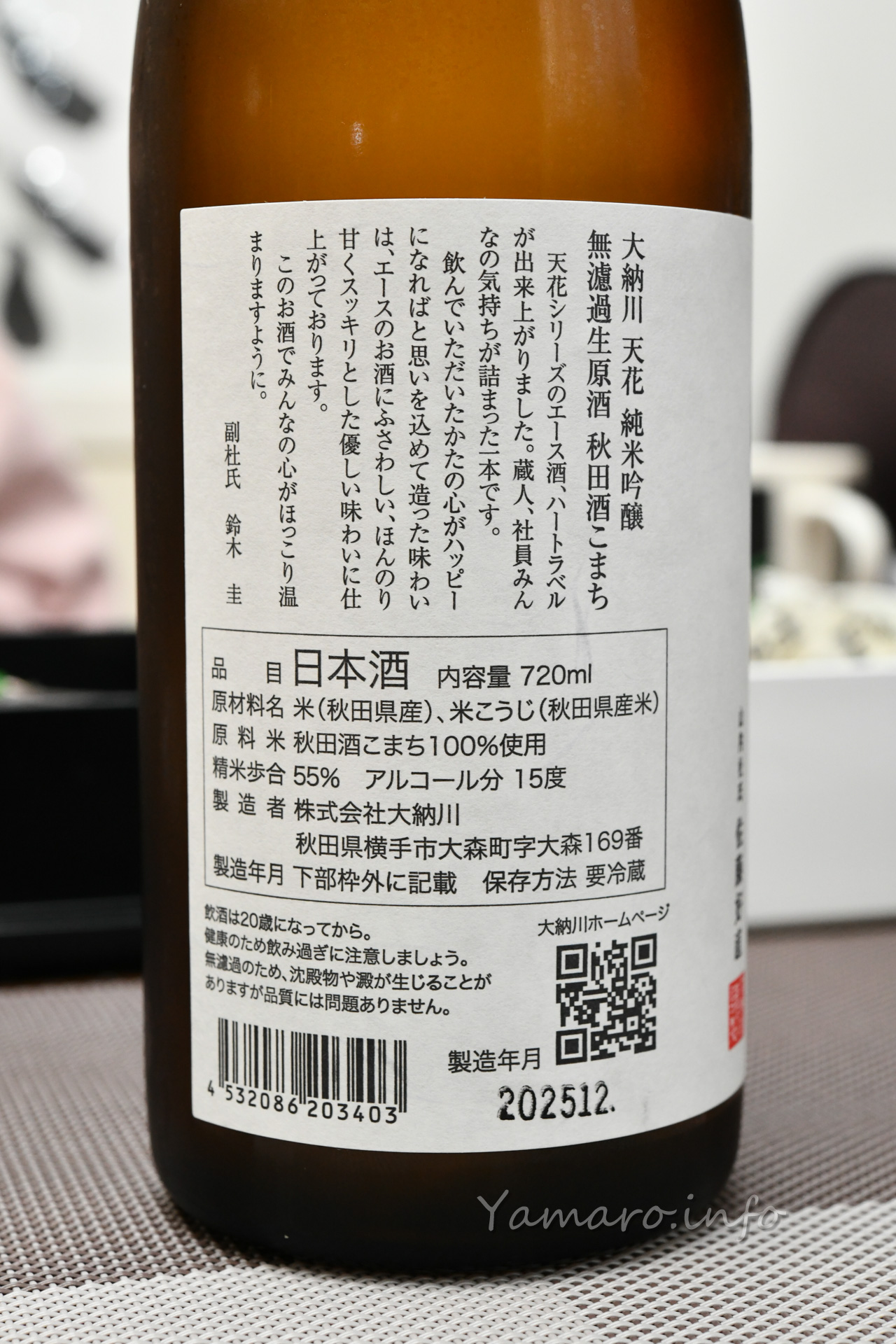 酒米に秋田県産酒こまちを精米歩合55%で、酵母は蔵付酵母D-29、日本酒度は色々な酒屋さんのサイトを見るとバラバラですが、ロットで多少変わるのでしょうか? わずかに甘口側のようですね。