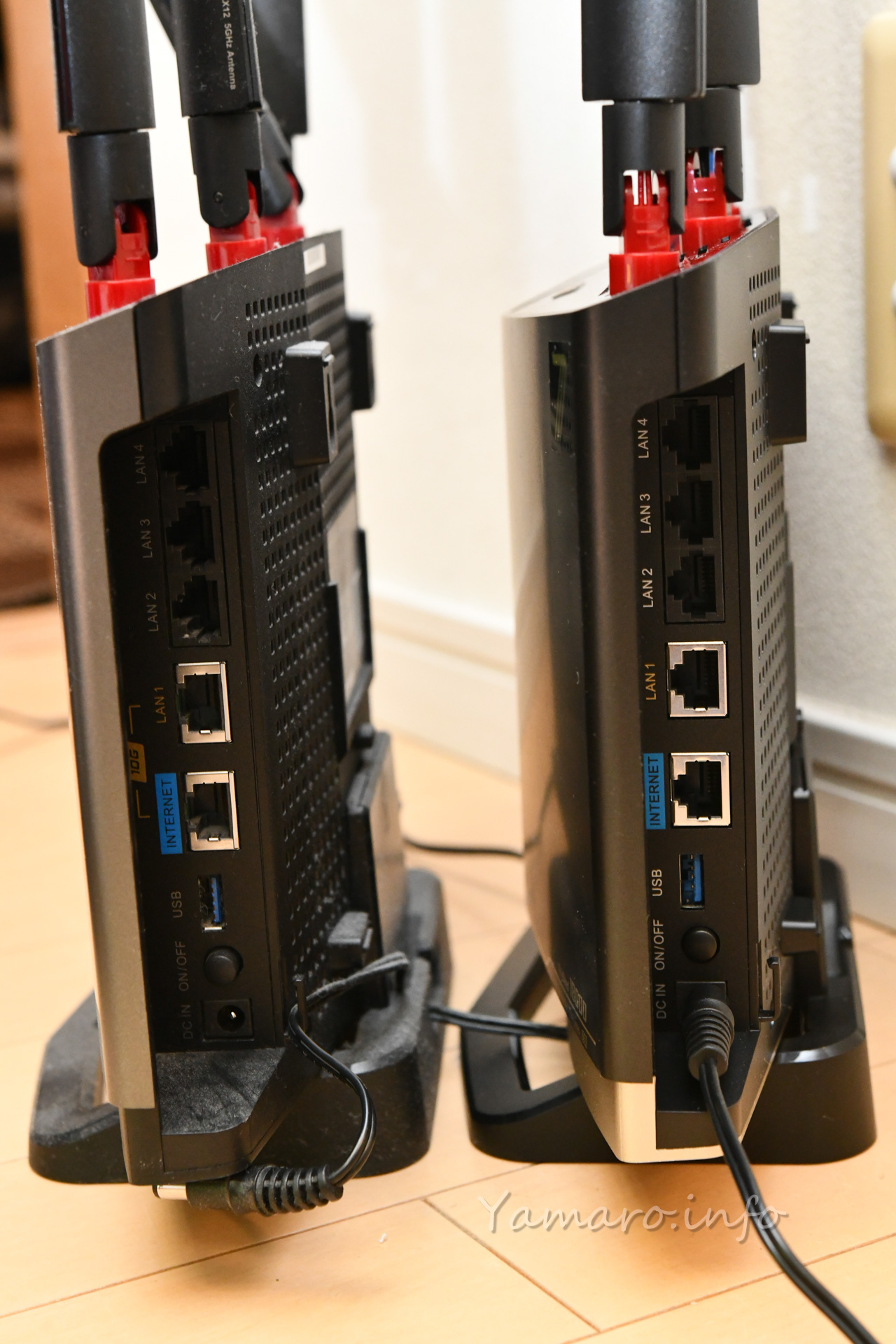細かい点での違いは、付属のACアダプタが、5950AX2ではACコード別体のACアダプタで長さがあったのに対し、18000BE10PはACコードなしの直付けタイプになったため、全体としてコードの長さが短くなっています。なるべく高いところに設置したい無線AN機器としてはちょっと短いため、延長コードを併用しました。
