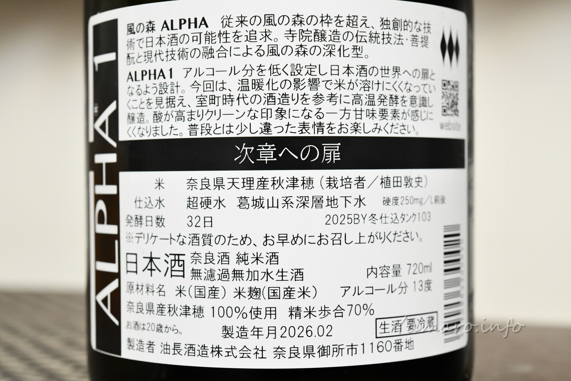 「次章への扉」はALPHAシリーズの原点ともなるお酒という意味合いも込めているそうで、以前の仕込みとは違った味わいになっているようです。