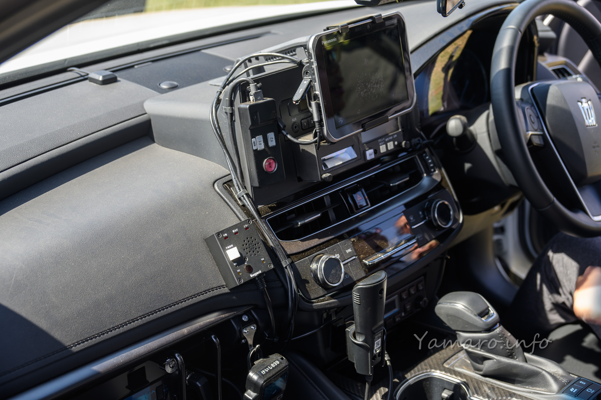 一般販売のクラウンはナビが標準装備されているスペースは化粧パネルで埋められていて、代わりに昔のポータブルナビの取り付けキットのようなホルダーに、Panasonicの業務用タブレットが装着されていました。