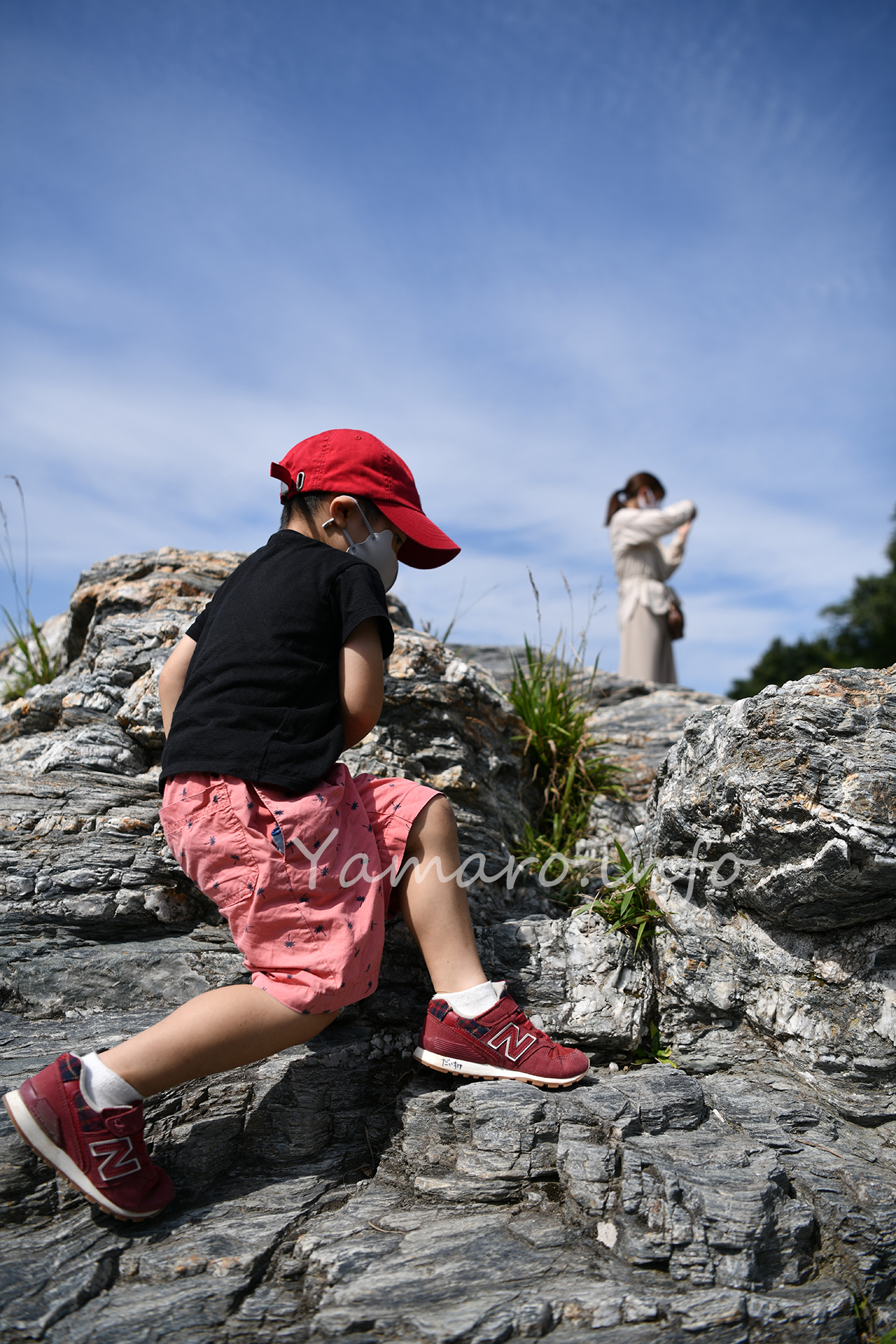 息子のマスクの紐あたりに注目