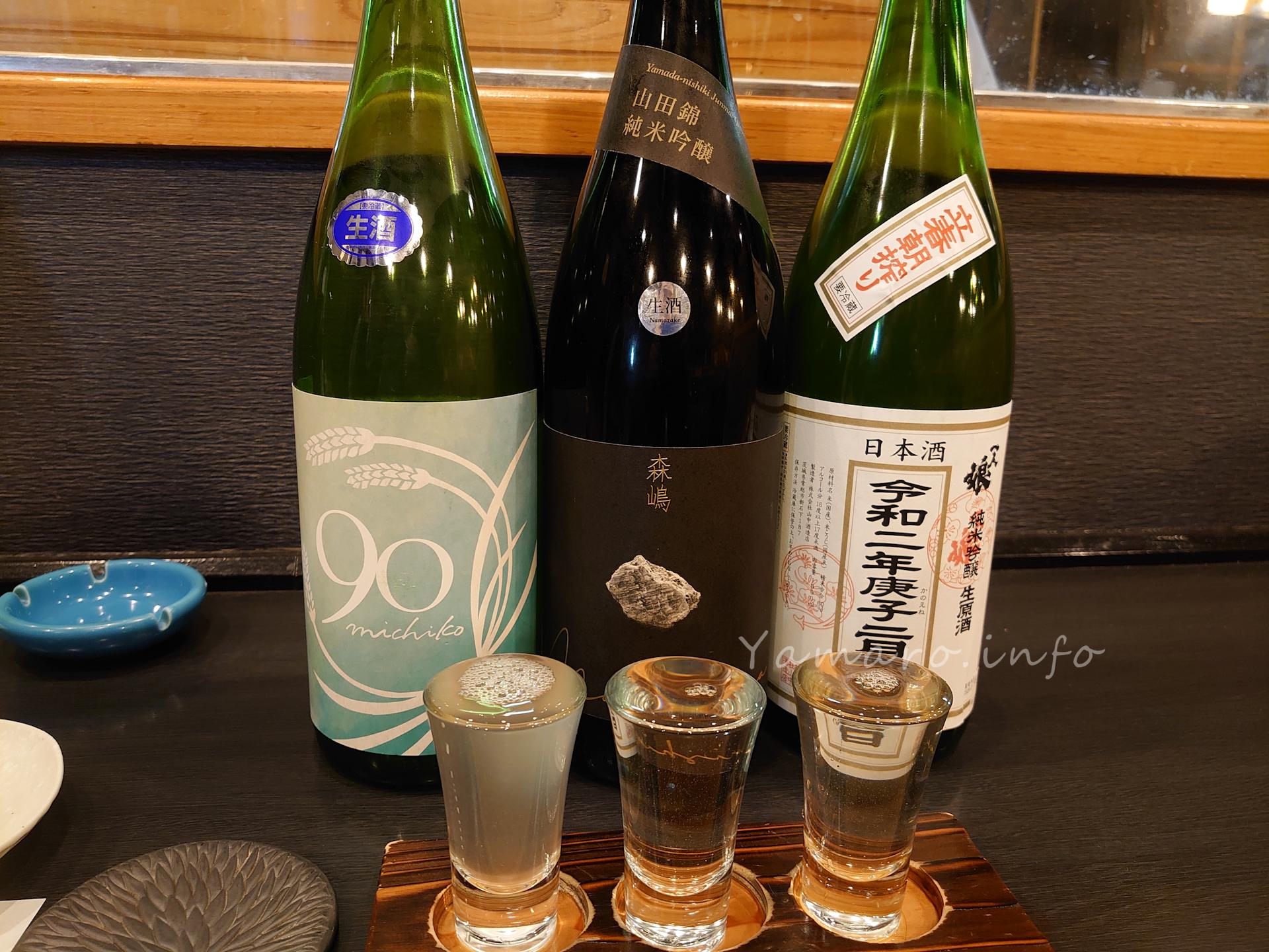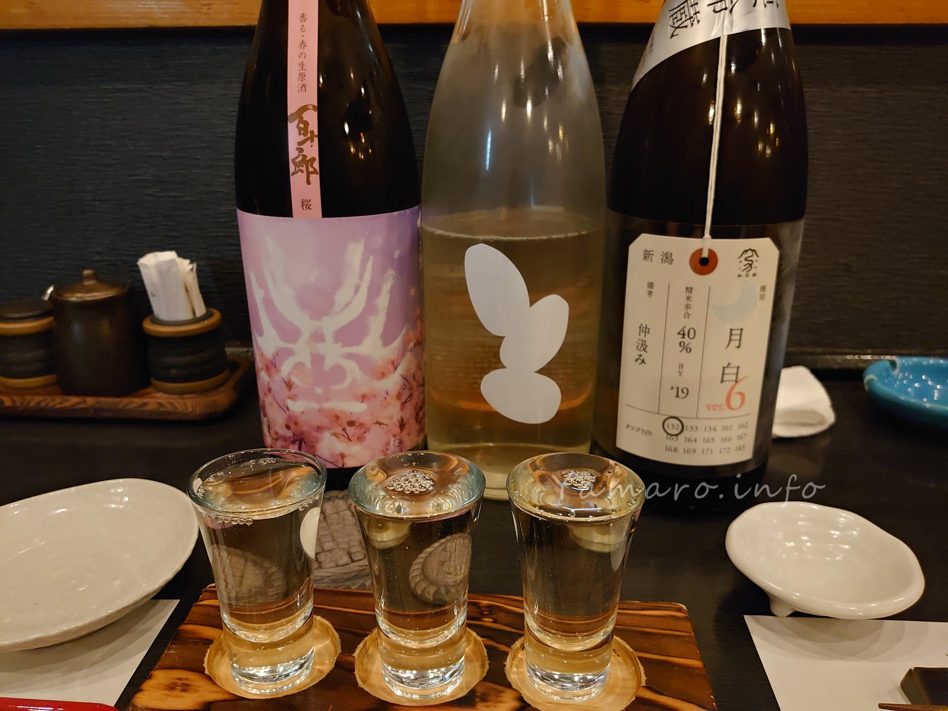 一見、普通の居酒屋で、飲み放題プランもある中、日本酒も壁一面にメニューが貼ってありまして、数種類いただきました。一合で一律700円、半合で350円と、半合は半額というのが良いですね。いろいろな種類を少しづつ飲めます。