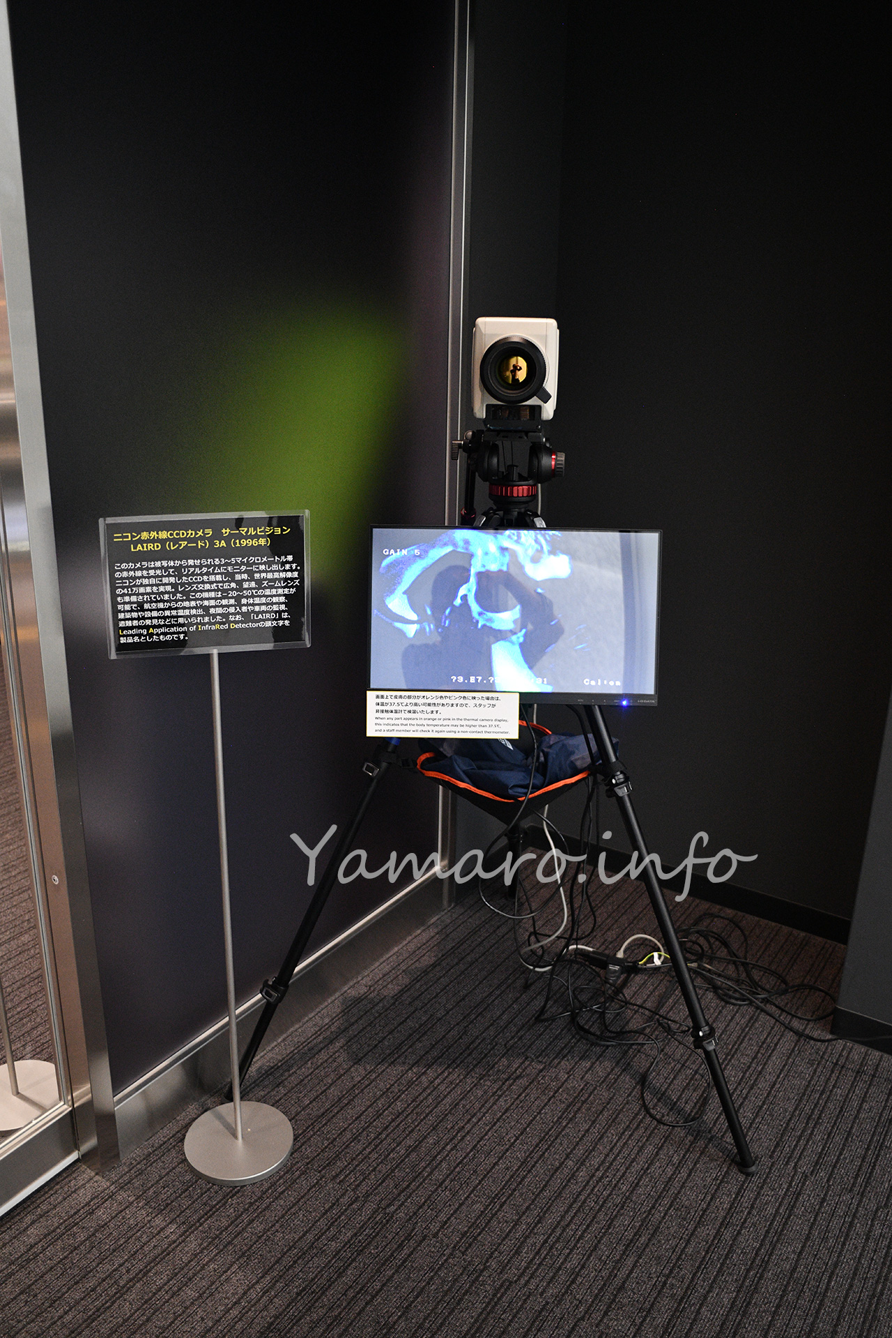 入口には、最近良く見かけるようになったサーマルカメラが設置されていましたが、これがなんと1996年にNikonが販売した赤外線CCDカメラ、LAIRD 3Aでした。既に四半世紀近く前に、Nikonはこのようなものを販売していたようです。残念ながら、公式を含めて、日本語でのこの製品の情報はほとんど無く、英語のページに紹介がありました。
