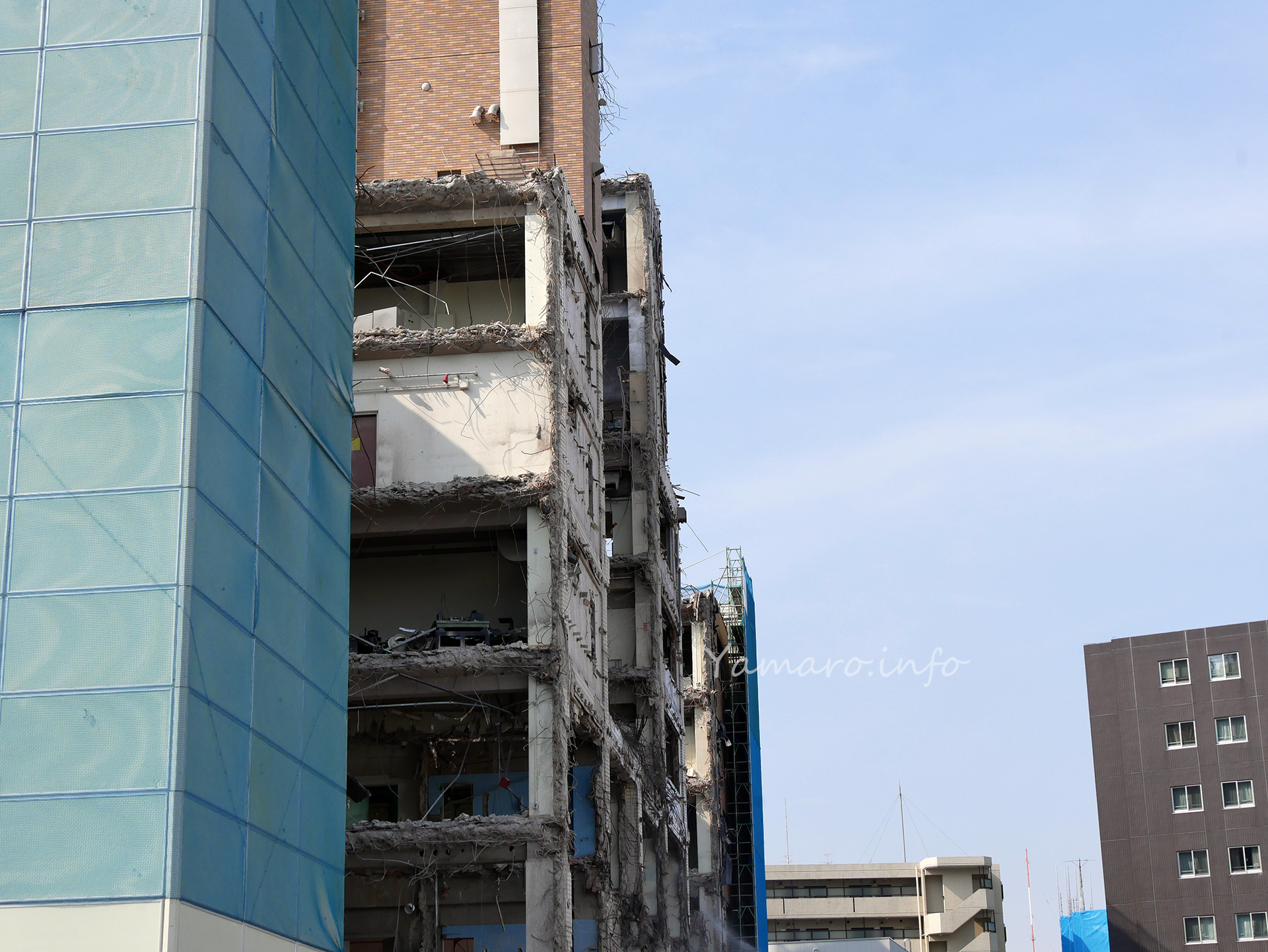 朝と比較して、中央部分の解体が進んで、通りを挟んだ向こうのマンションが見えるようになってきました。