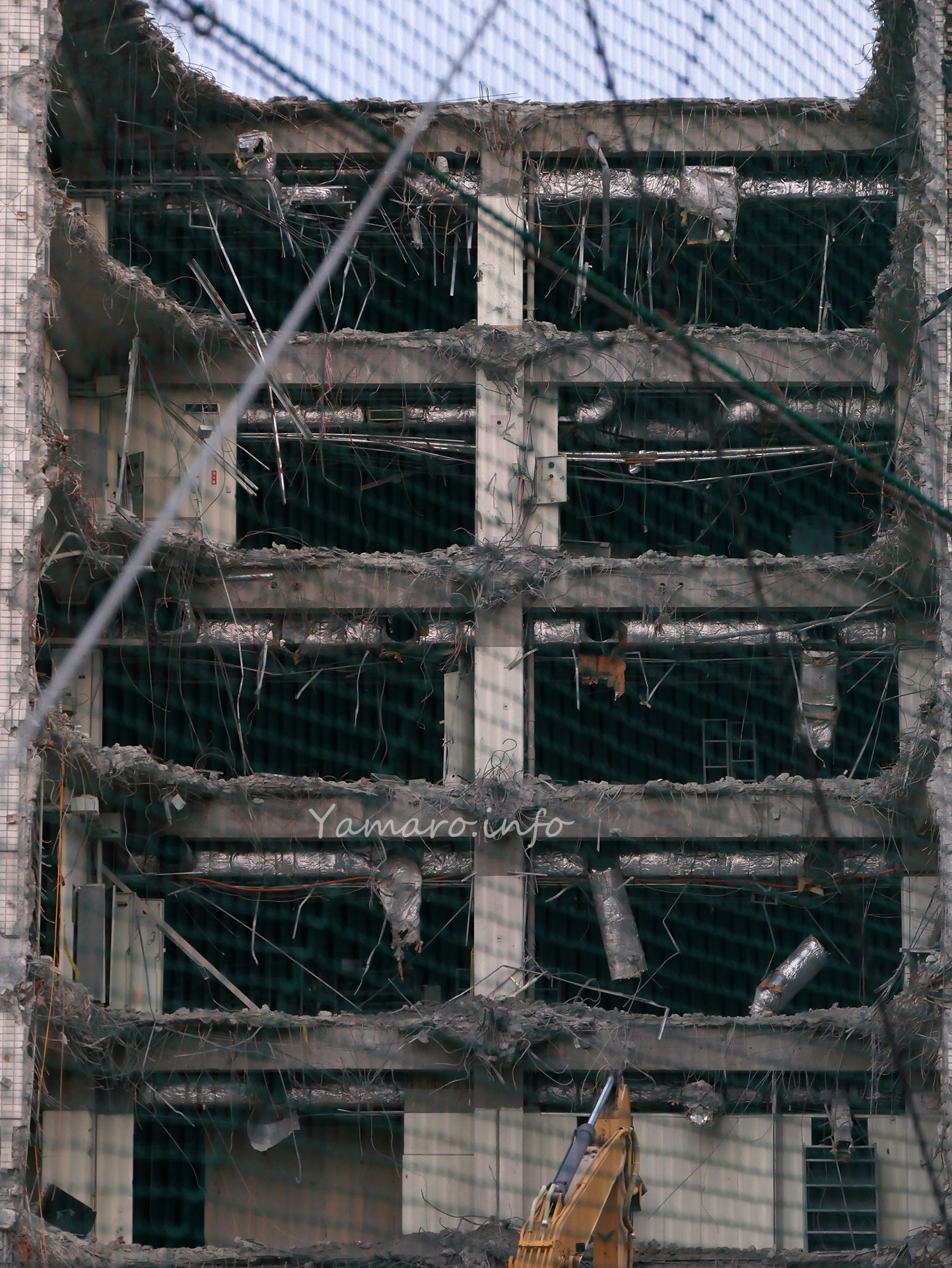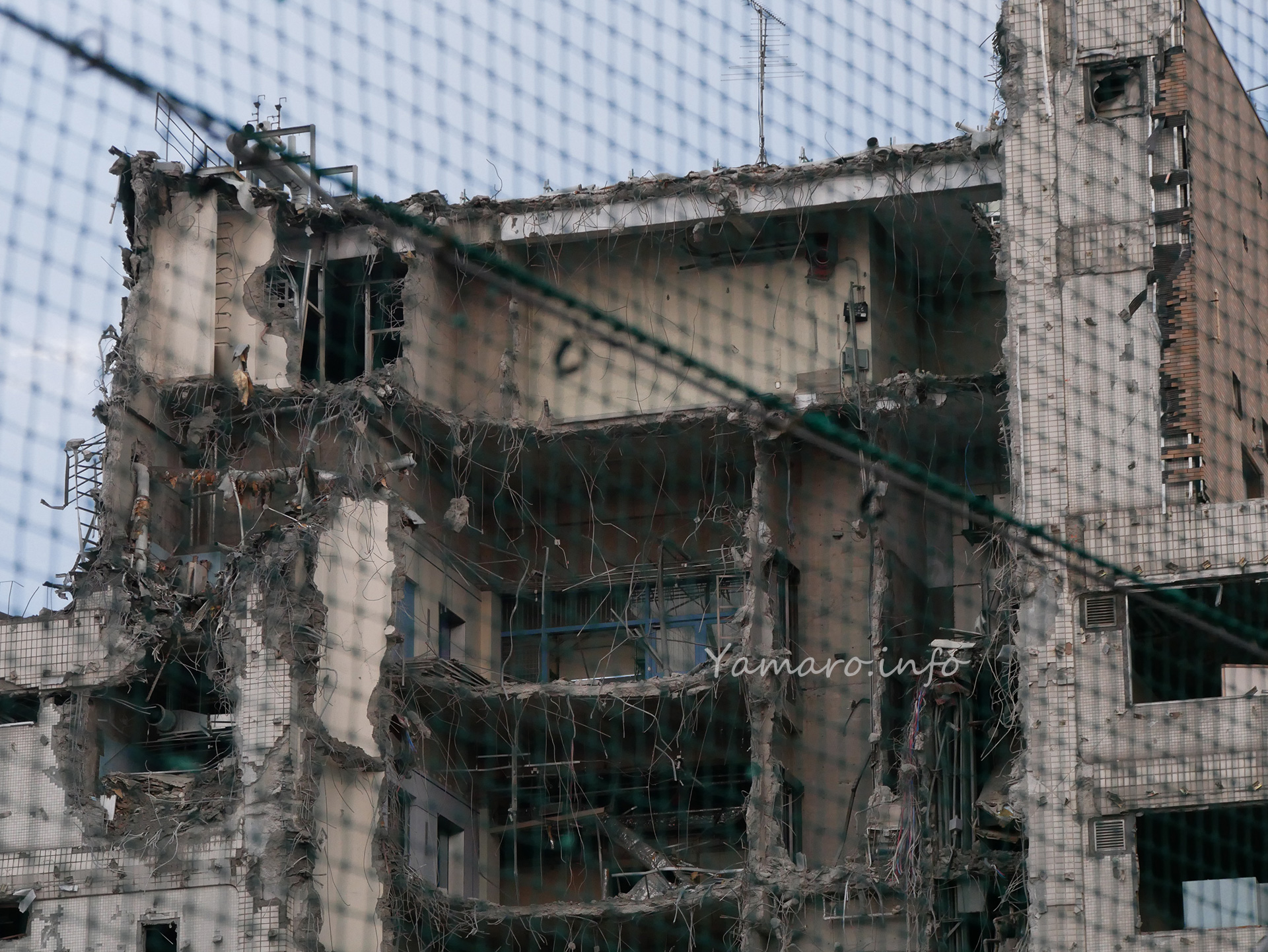 メインビルの中央部分の解体が進んで、防音壁とネットが撤去されています。入り口の守衛所は最後に解体するのでしょうね。