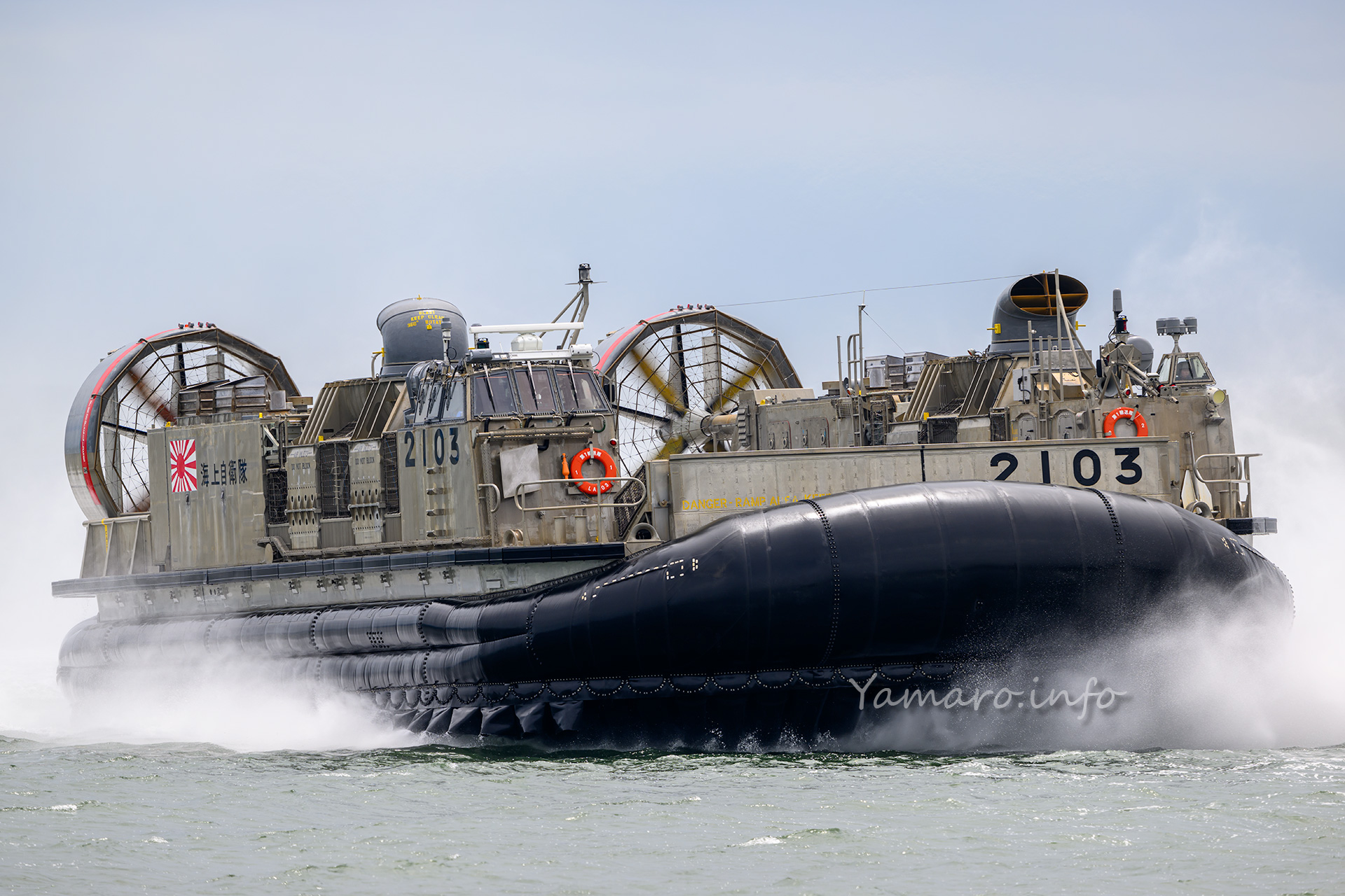 訓練は基本的に、浜辺への上陸と離脱を繰り返す感じですね。近くで見るとなかなかダイナミックです。 車両などの搭載はありませんでした。 そしてものすごい海水を浴びるわけで、訓練後の真水による洗浄が欠かせないそうです。推進用プロペラにはサビが見られるのも、そらアレだけ海水を浴びればそうだよなぁと。