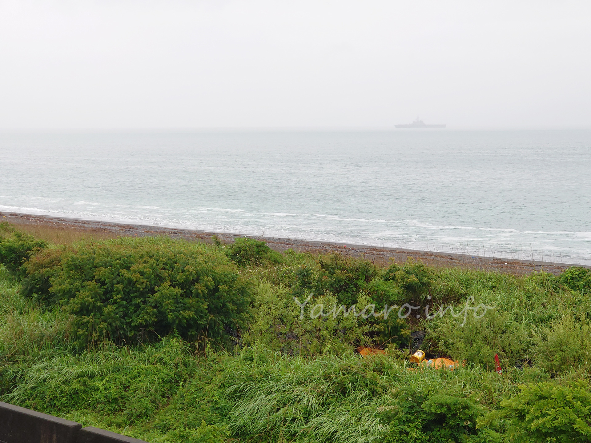浜辺に降りてみました。浜辺には訓練境界線の旗と監視する自衛官が立っており、旗が立っている範囲の外側から見学してくださいとのことでした。