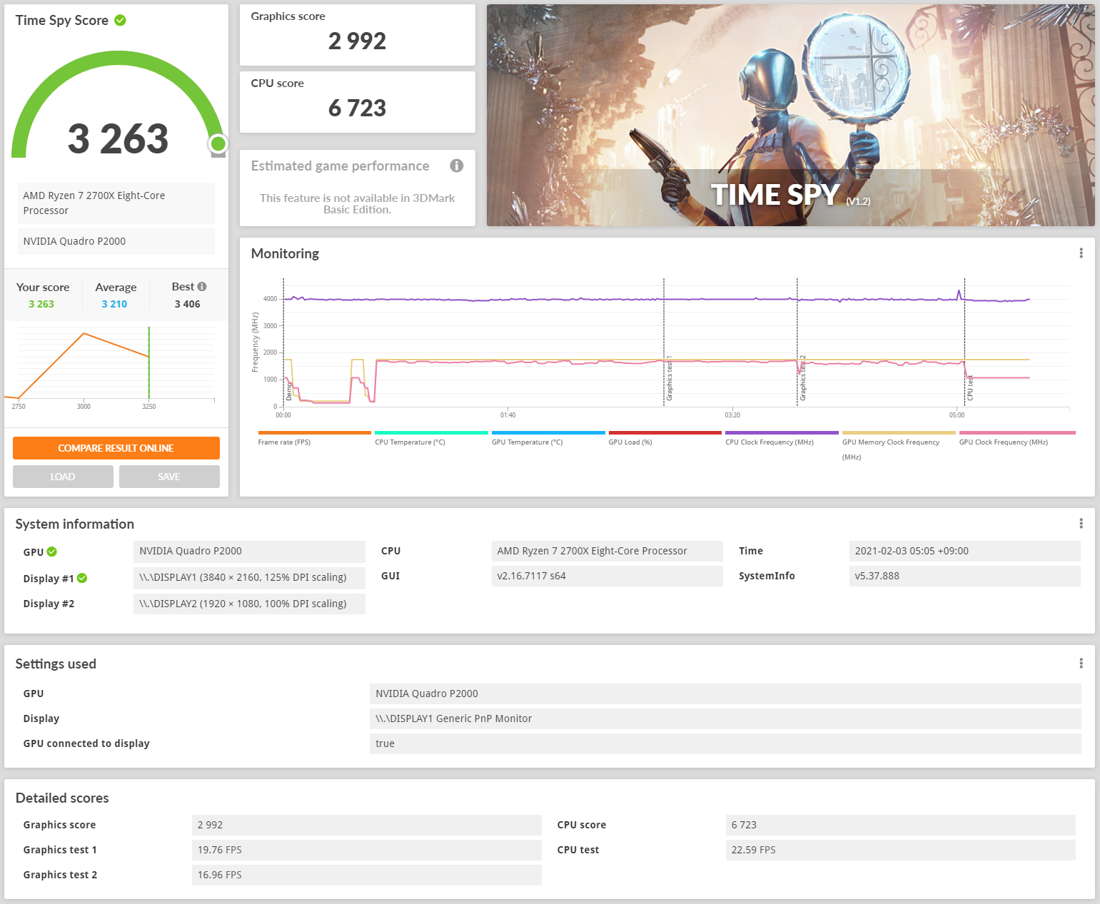 さすがに、全然スコアが違うし、デモ動画でも滑らかさが違いました。P2000は、GeForceのエントリークラスくらい?